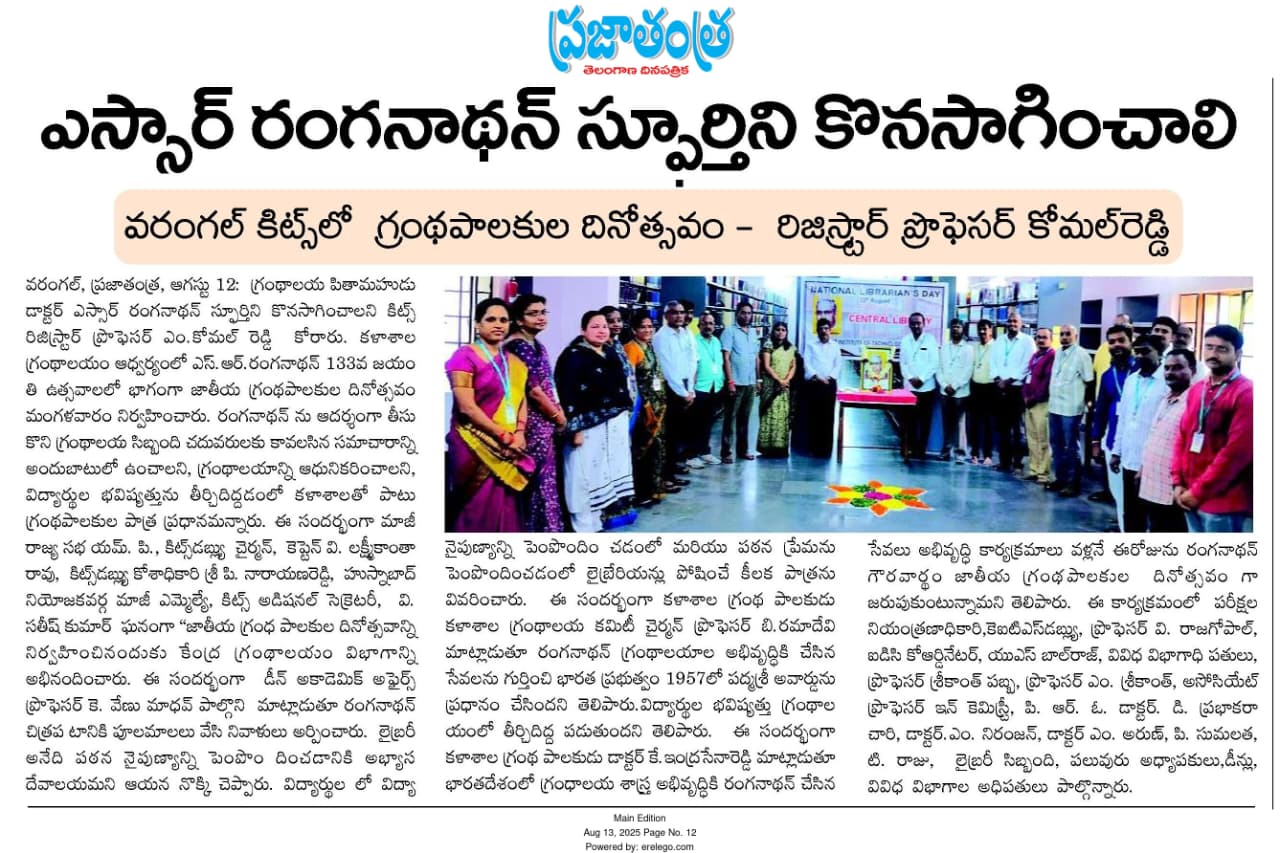 Central Library, KITW celebrated 133th National Librarians' Day on 12th August, 2025 @ KITS, Warangal.