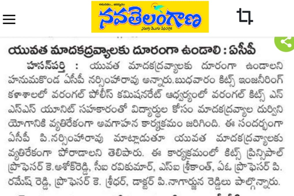 As per Telangana State Govenment Guidelines NSS, KITSW and Warangal Police Commissionerate jointly organized "Anti Drug Awareness Programme" on 12th August, 2025 @ KITS, Warangal.