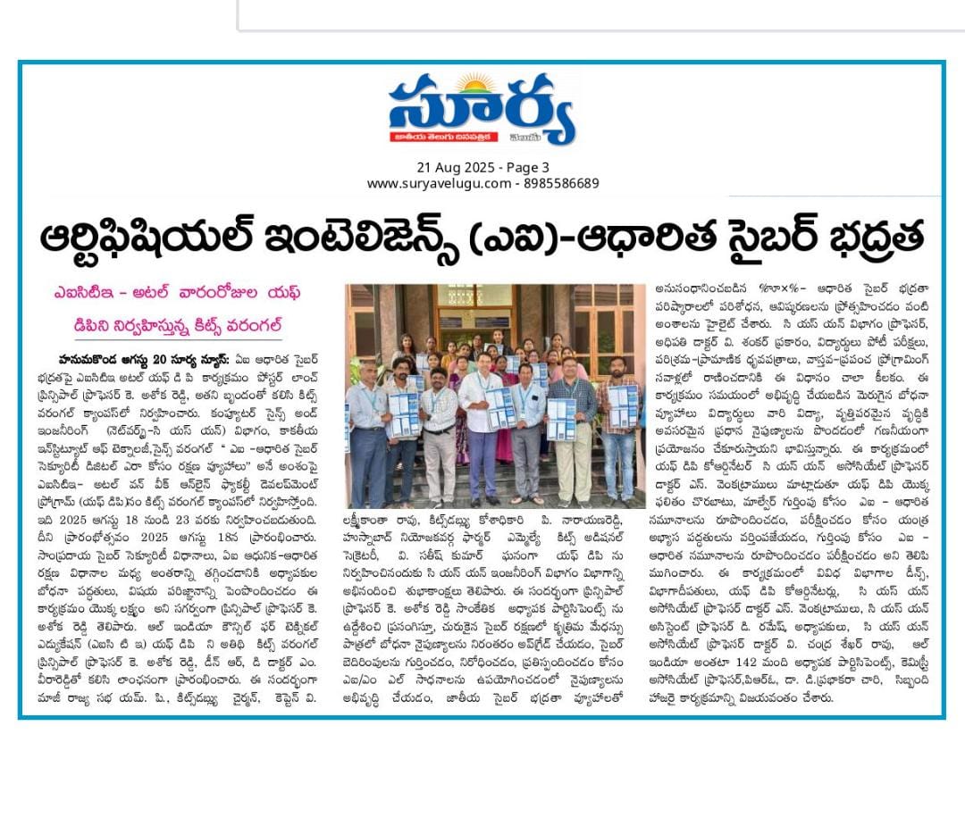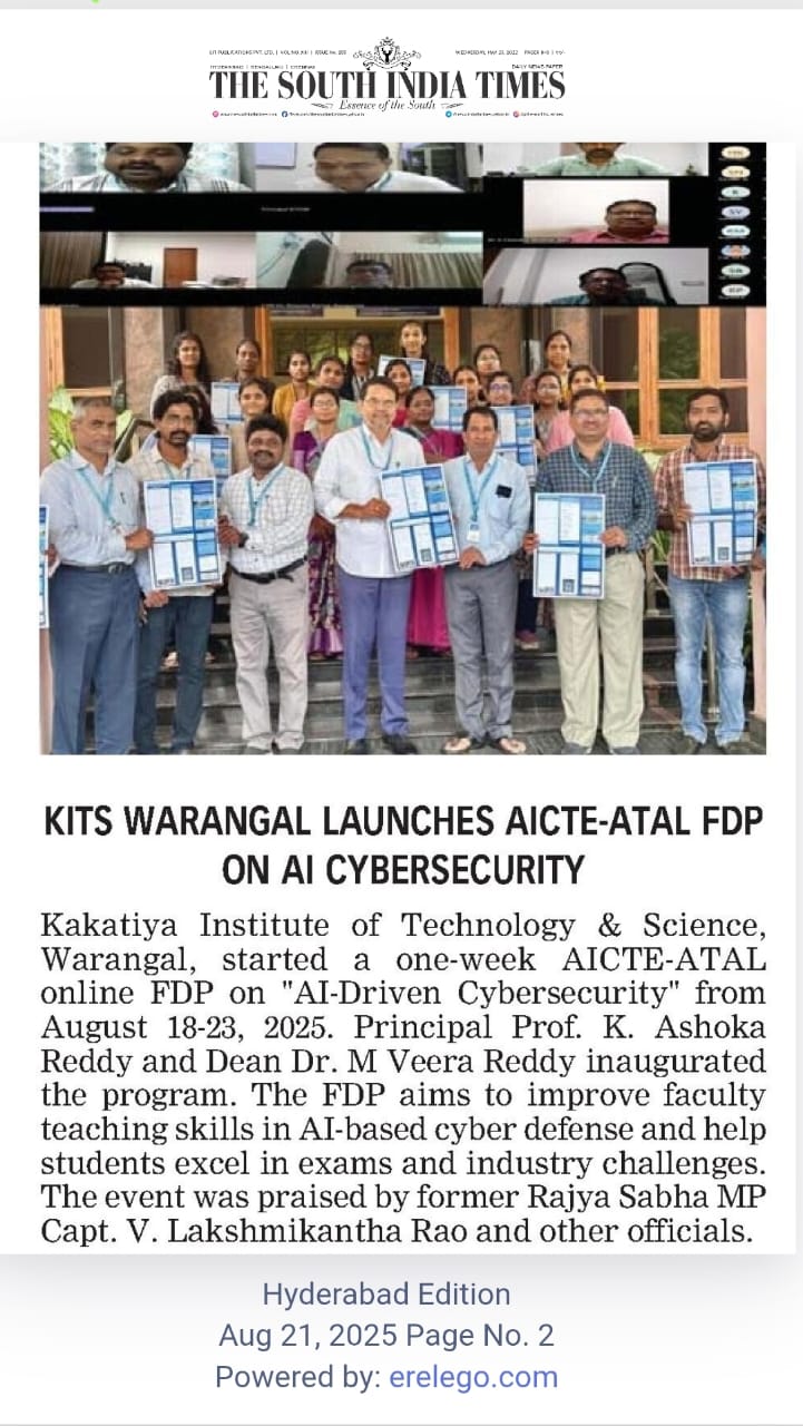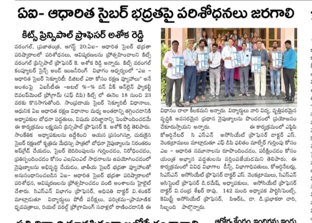 KITS, Warangal organized a one-week AICTE-ATAL Faculty Development Programme(FDP) on AI-Driven Cyber Security" August 18-23, 2025.