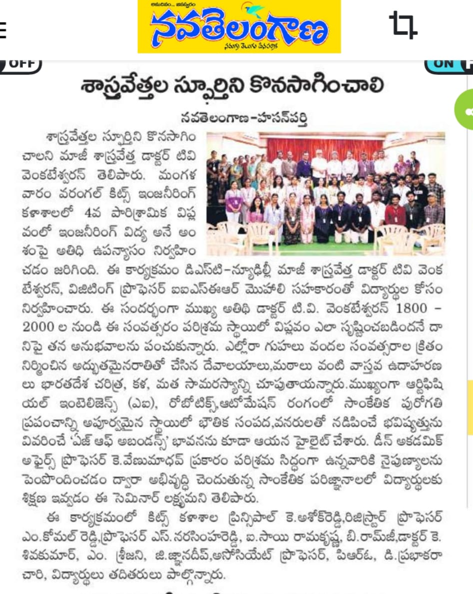 The Chief Guest, Dr. T.V. Venkateswaran — a faculty member at IISER Mohali and former Scientist F and Division Head at Vigyan Prasar, Department of Science and Technology — addressed the gathering on the topic 'The Fourth Industrial Revolution in Engineering Education' on 19th August 2025 @ KITS, Warangal.
