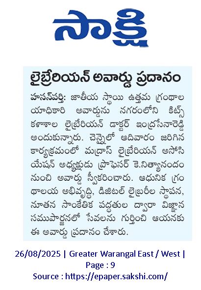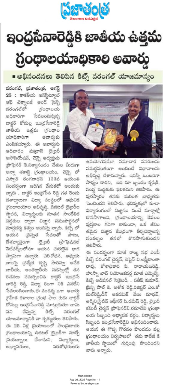 Dr. Komalla Indrasena Reddy, Librarian of Kakatiya Institute of Technology and Science (KITS), Warangal was honoured with the Best Librarian Award by Prof. K.Nityanandam, President, Madras Library Association, Chennai on 24th August, 2025 at Anna Centenary Library, Chennai.