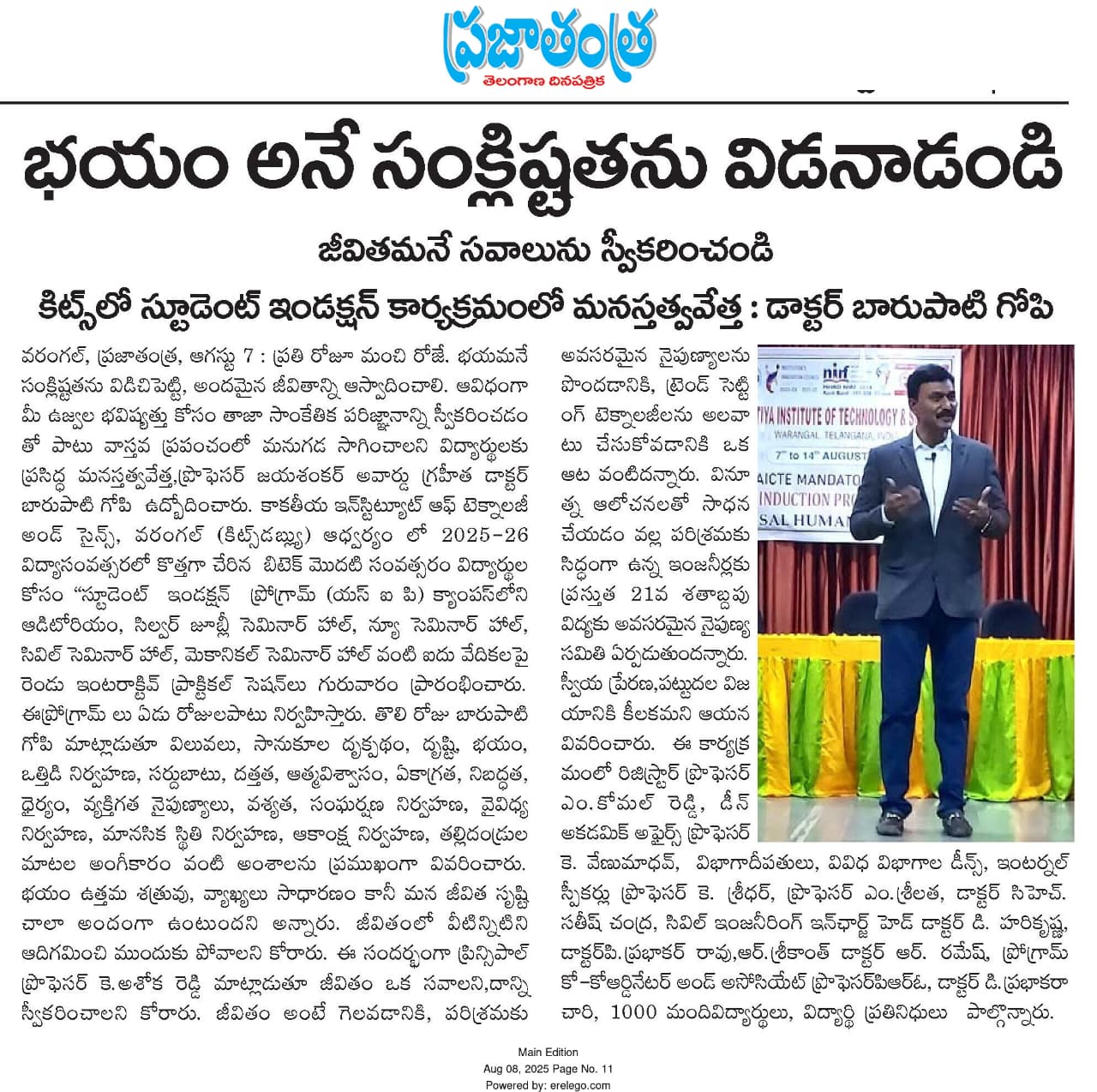 KITS, Warangal conducted a seven day AICTE-mandated "Student Induction Program(SIP)" with two interactive sessions titled "Career Planning, Development pf Positive Attituted" aand "Life is Beautiful" for the newly admitted B.Tech. I Year students.