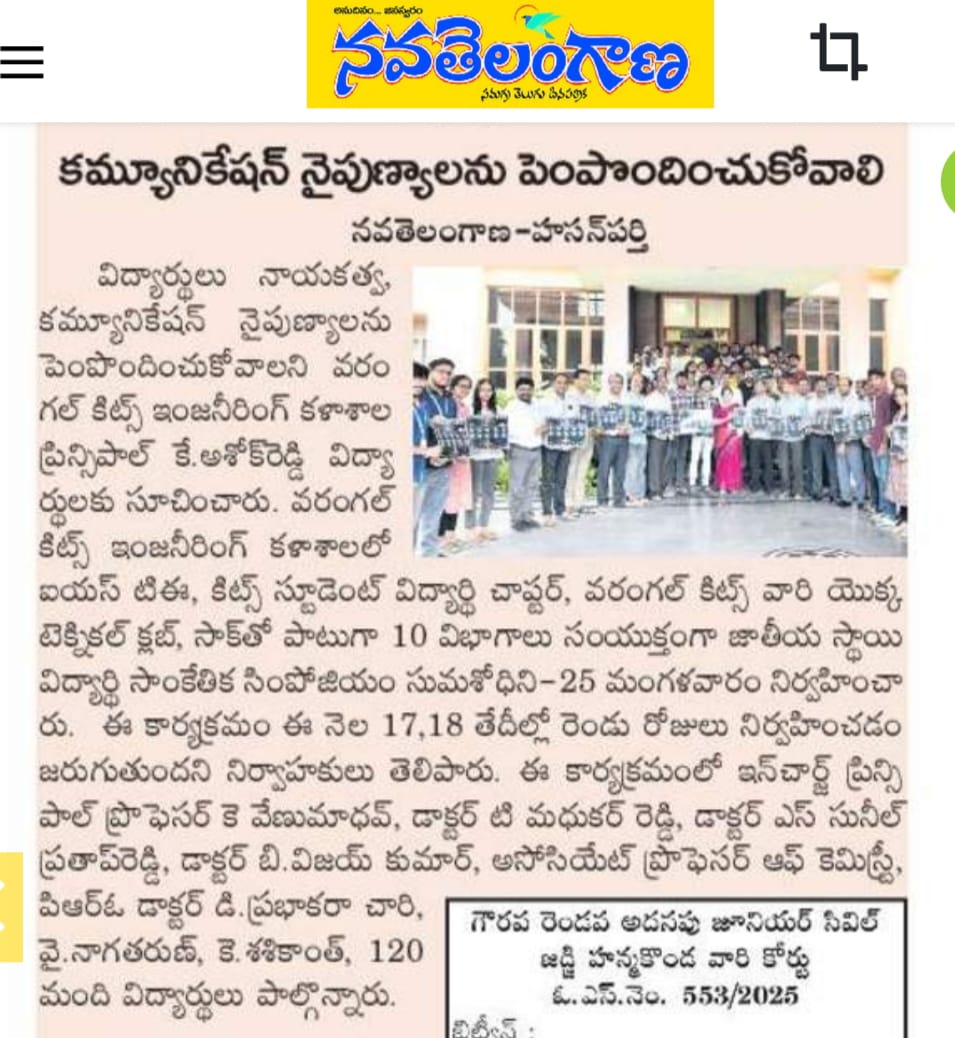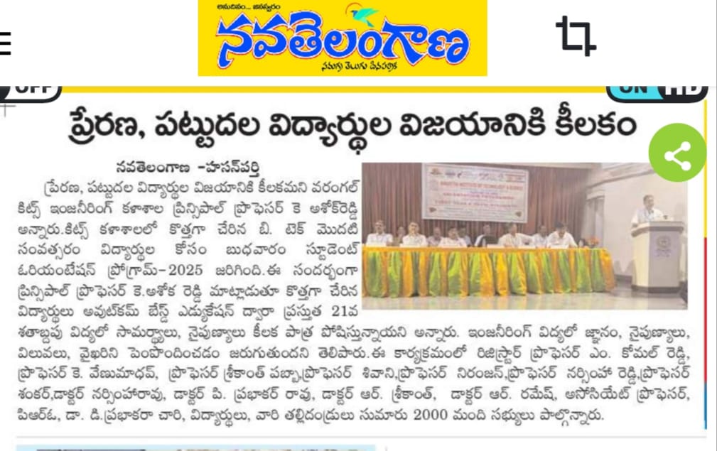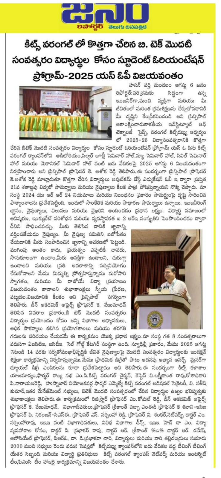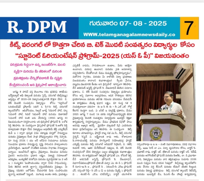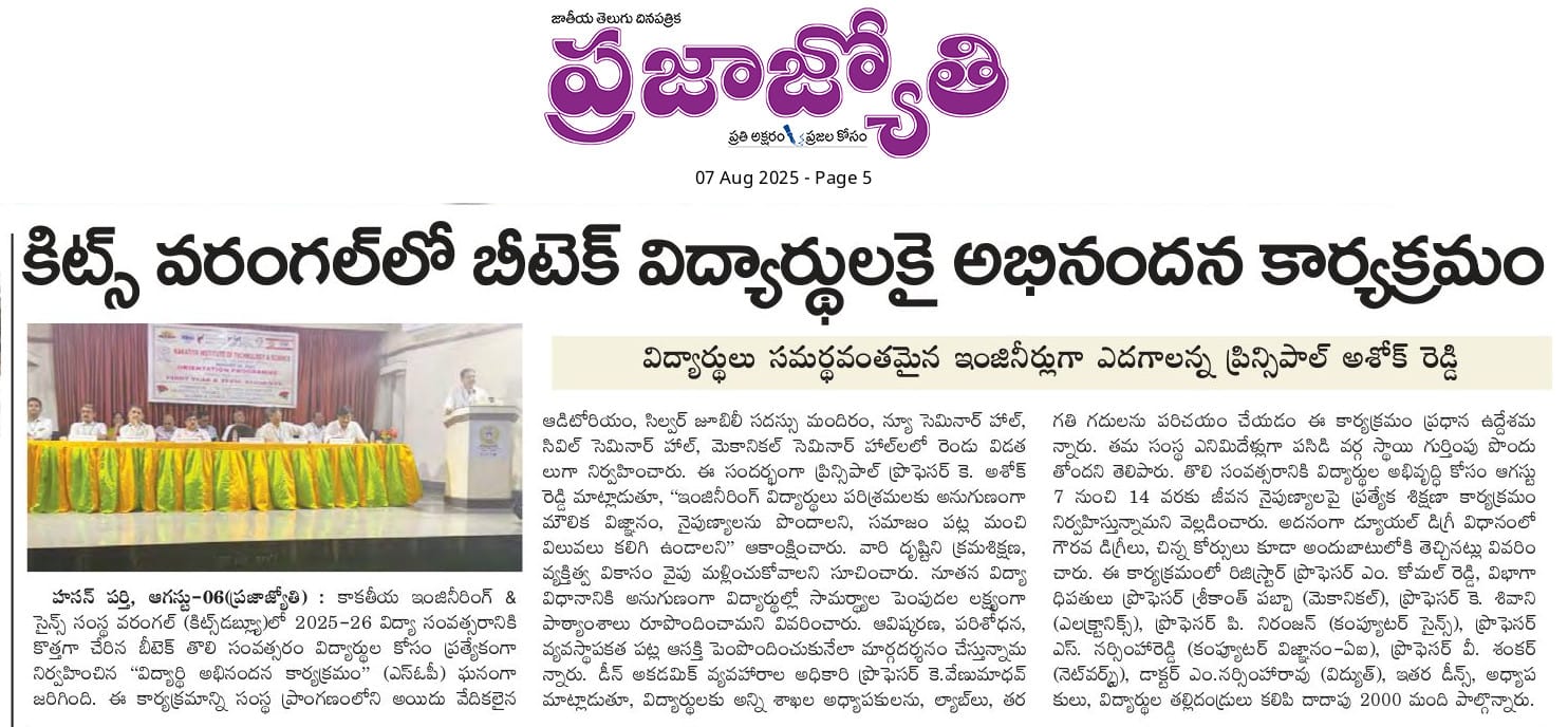 KITS, Warangal conducted "Student Orientation Program-2025" for the newly admitted B.Tech. I Year students for the academic year 2025-26.