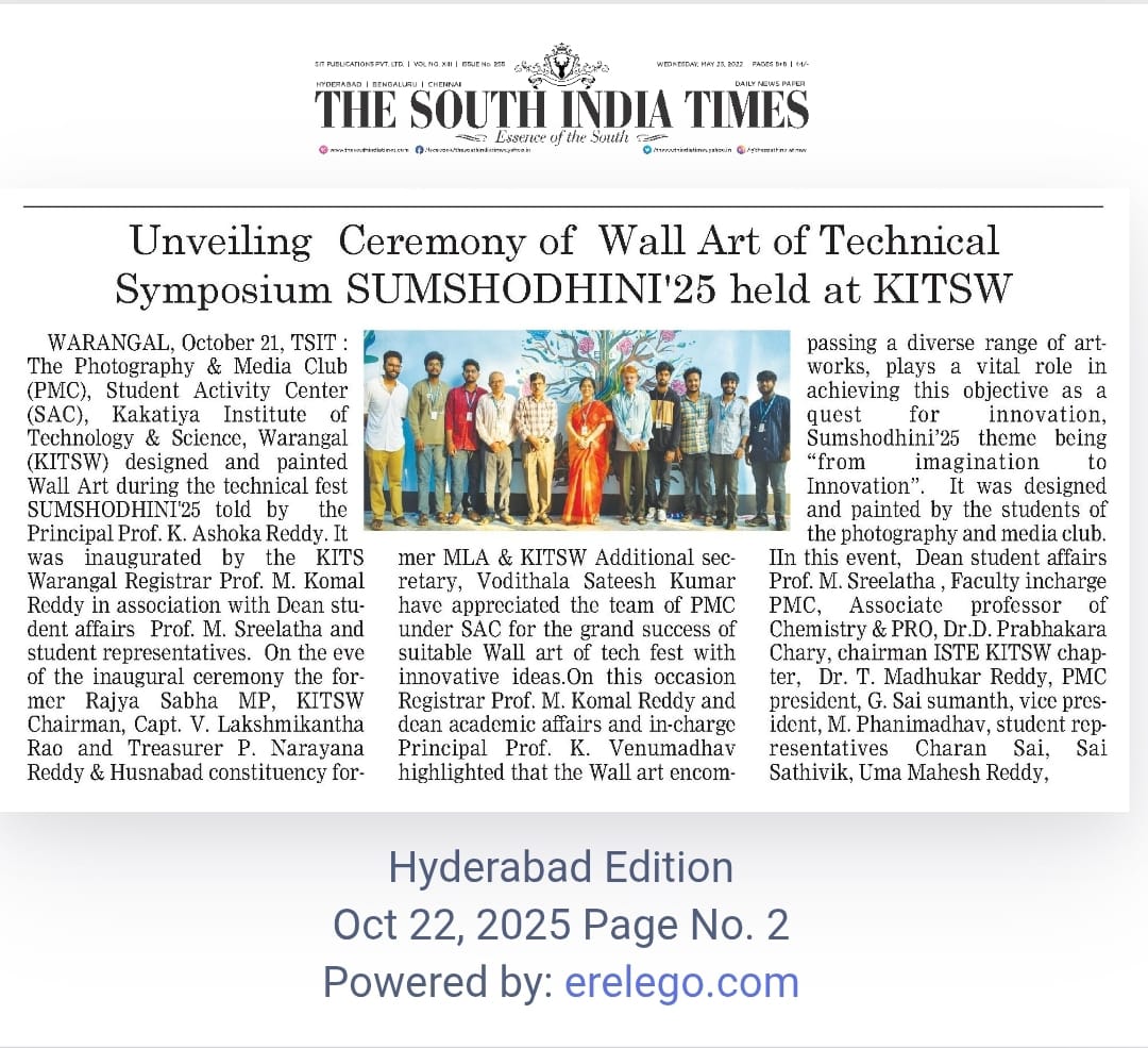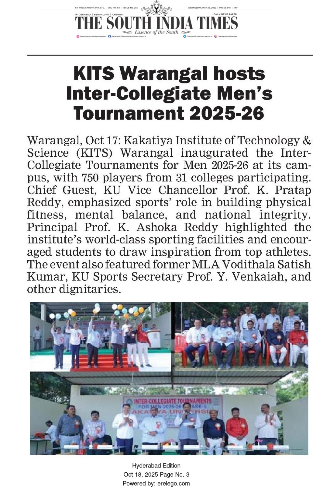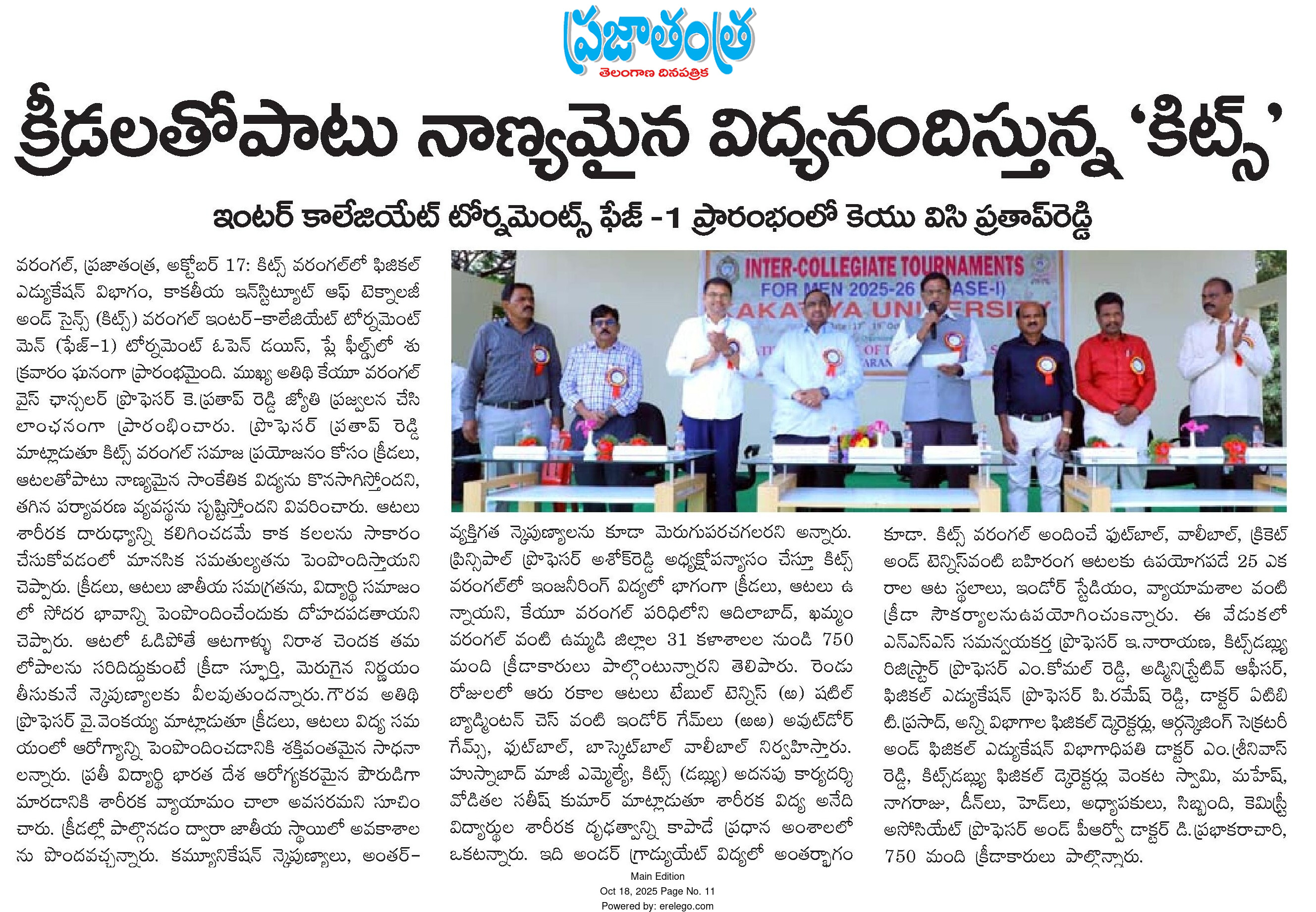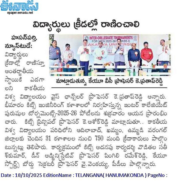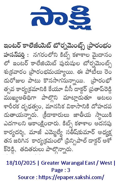 Kakatiya Institute of Technology and Science, Warangal hosts "Inter-Coolegiate Tournaments for Men 2025-26" held during 17-18 October, 2025.
