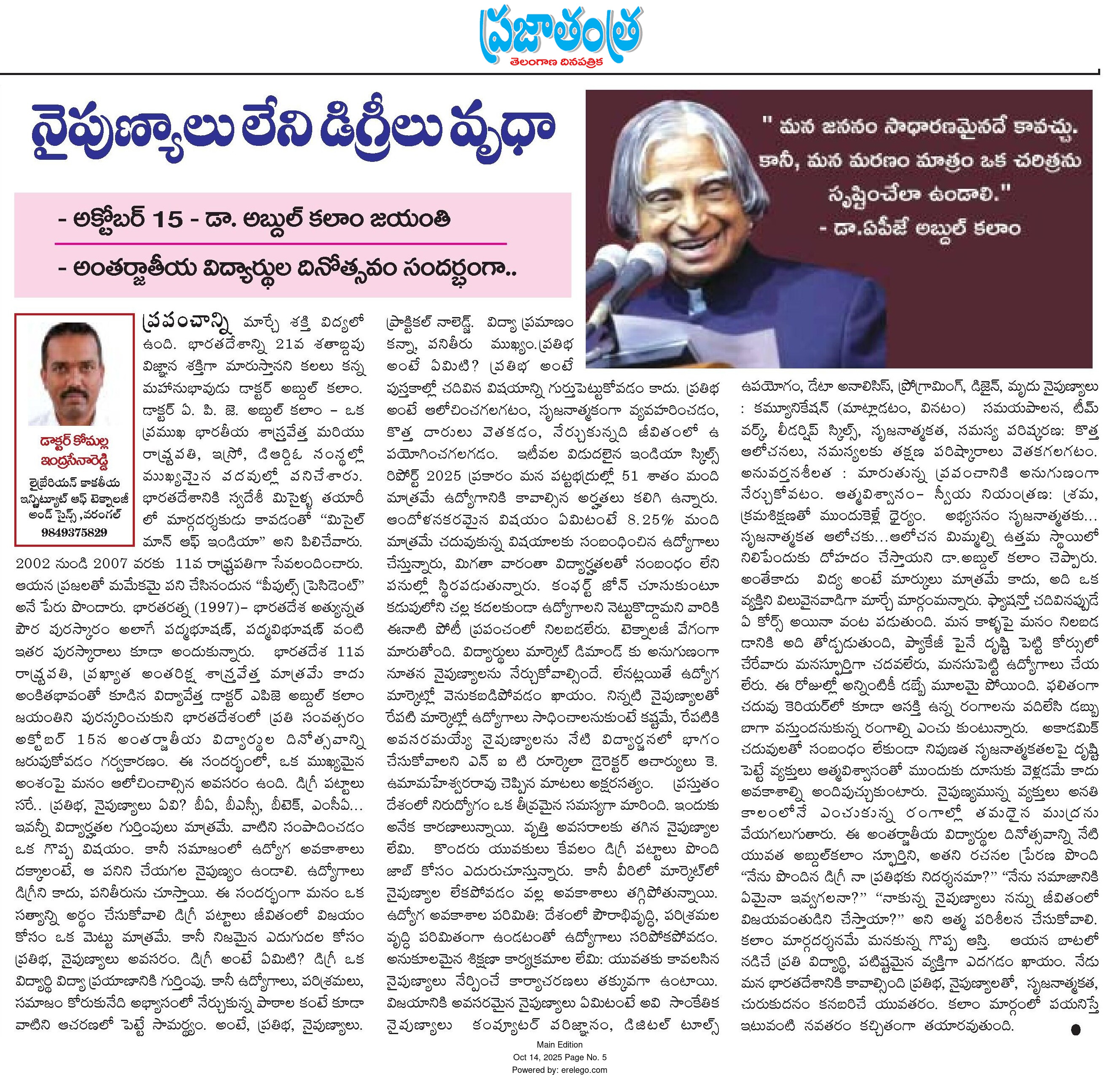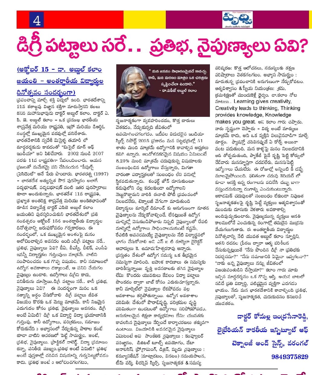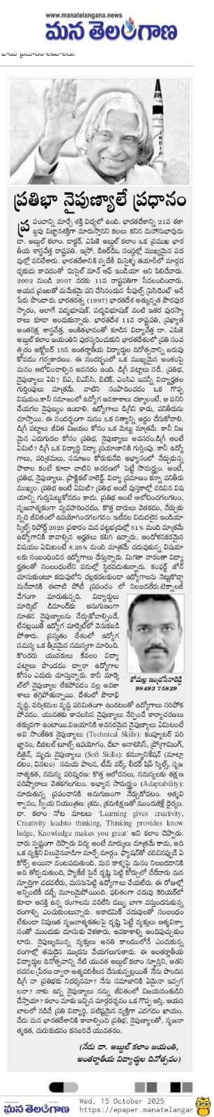Kakatiya Institute of Technology and Science, Warangal celebrates "International Students Day" on the occation of Dr. A P J Abdul Kalam Jayanti on 15th October, 2025.