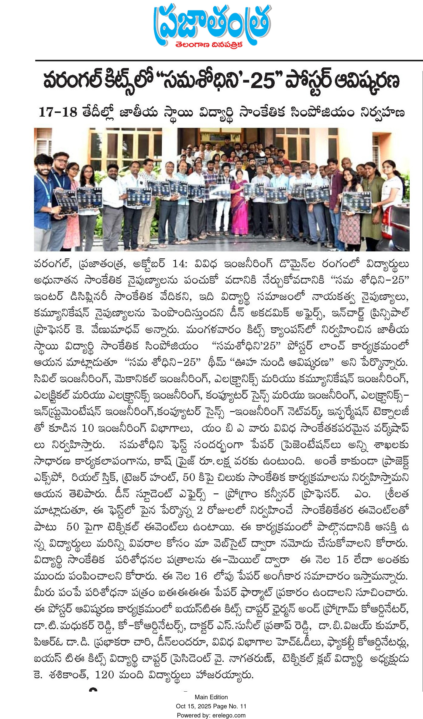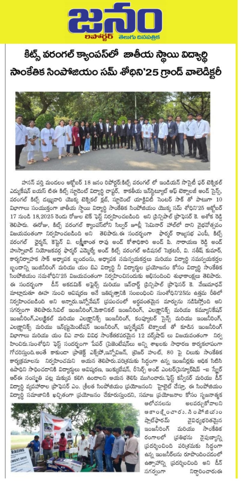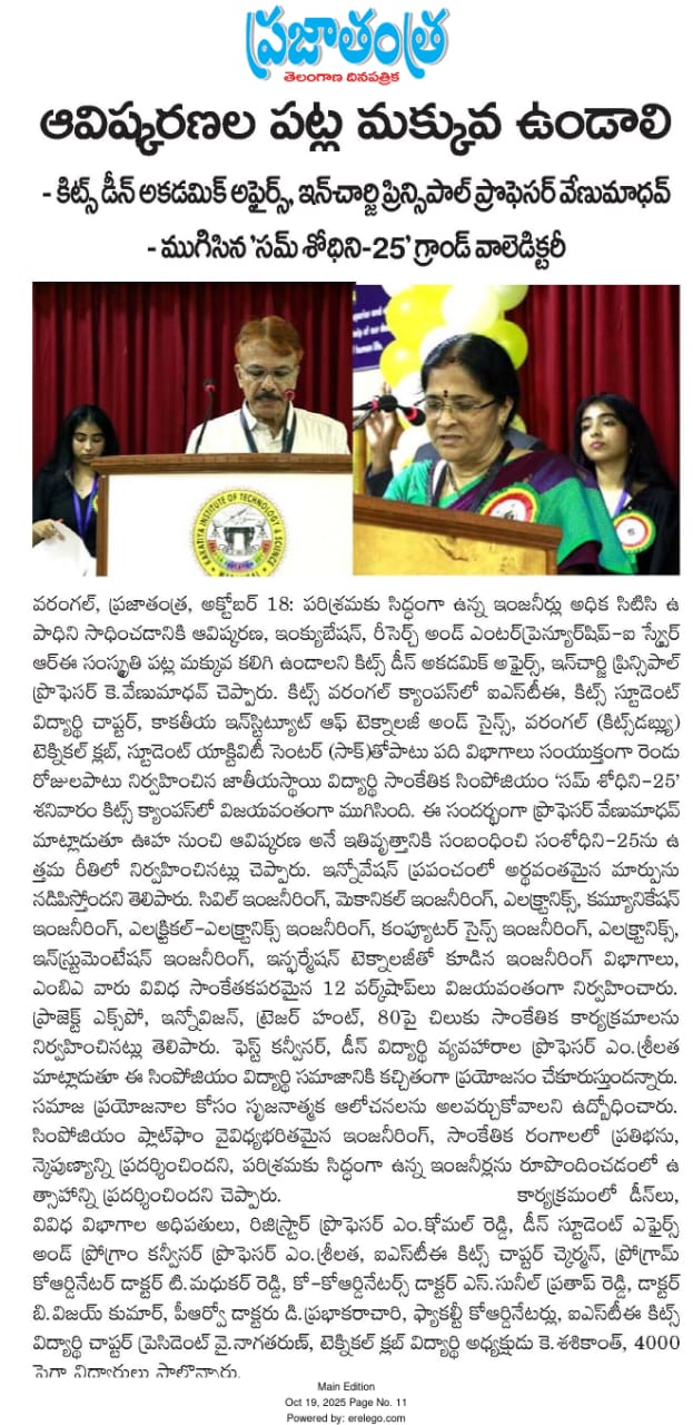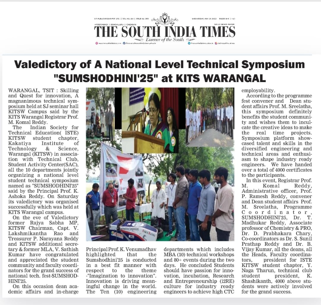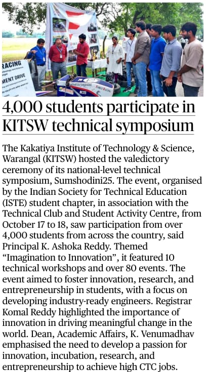 Kakatiya Institute of Technology and Science, Warangal hosts the valedictory ceremony of national level technical symposium"SUMSHODHINI'25" on 18th October, 2025.