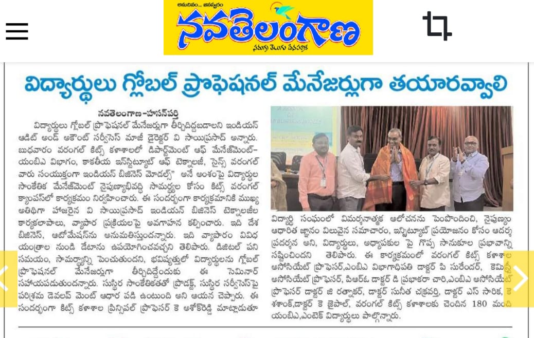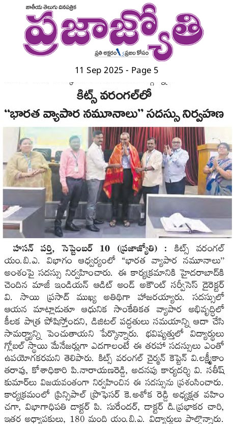 The Department of MBA, Kakatiya Institute of Technology and Science, Warangal organized a Seminar on "Indian Business Models" on 9th September, 2025 at the Campus.