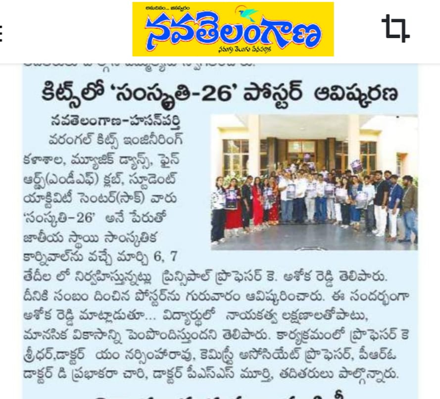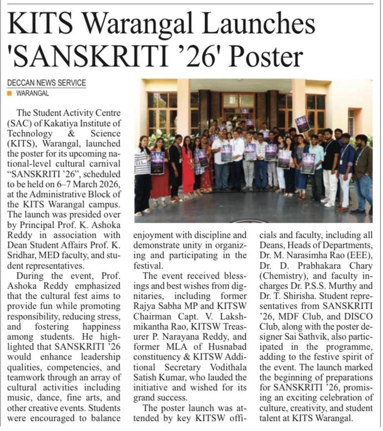 Student Activity Centre(SAC), KITS, Warangal launches 'SANSKRITI'26 Poster scheduled to be held on 6-7 March, 2026 at the Administrative Block on 12th February, 2026 @ KITS, Warangal