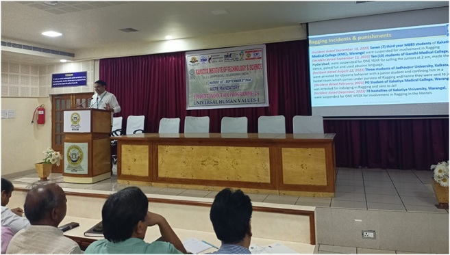 Prof. K. Ashoka Reddy, Principal addressing the faculty& students on ragging incidents and punishments on the eve of Anti- Ragging Sensitization programme held on August 30, 2024 |