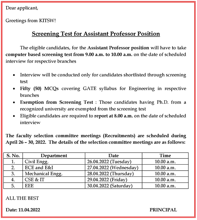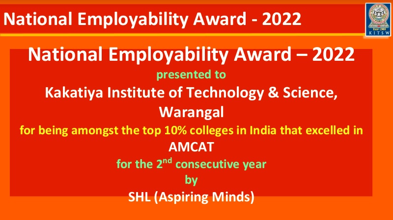 National Employability Award – 2022 presented to KITSW for being amongst the top 10% colleges in India that excelled in AMCAT for the 2nd consecutive year by SHL (Aspiring Minds). Date: 10th October, 2021.
