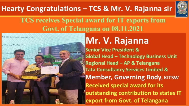 Hearty Congratulations – Mr. V. Rajanna sir Senior Vice President & Global Head – Technology Business Unit, Regional Head – AP & Telangana Tata Consultancy Services Limited & Member, Governing Body, KITSW Received Received special award for its outstanding contribution to states IT export from Govt. of Telangana.