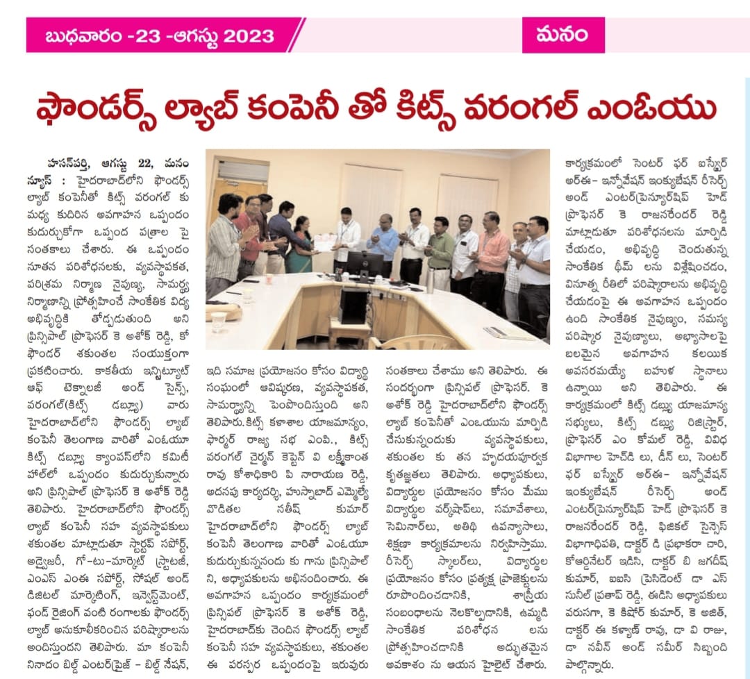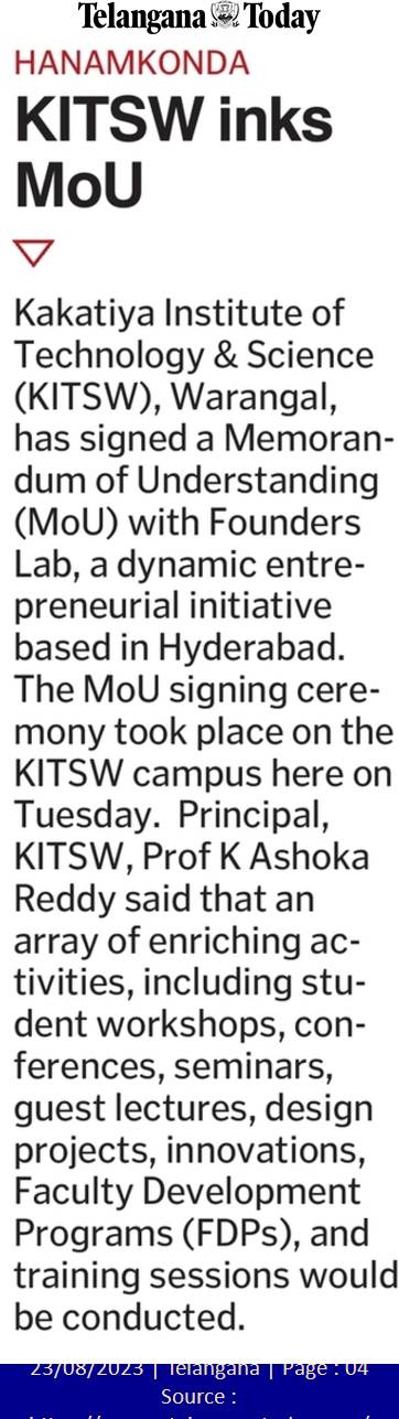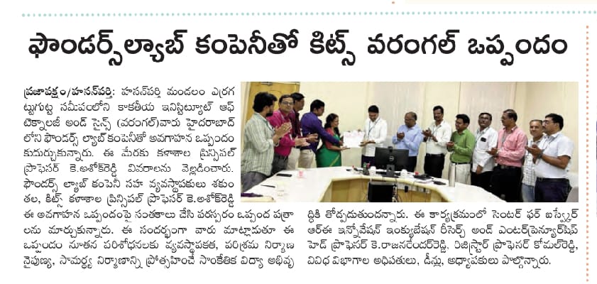 KITS, Warangal has signed a Memorandum of Understanding(MoU) with Founders Lab India, Hyderabad.