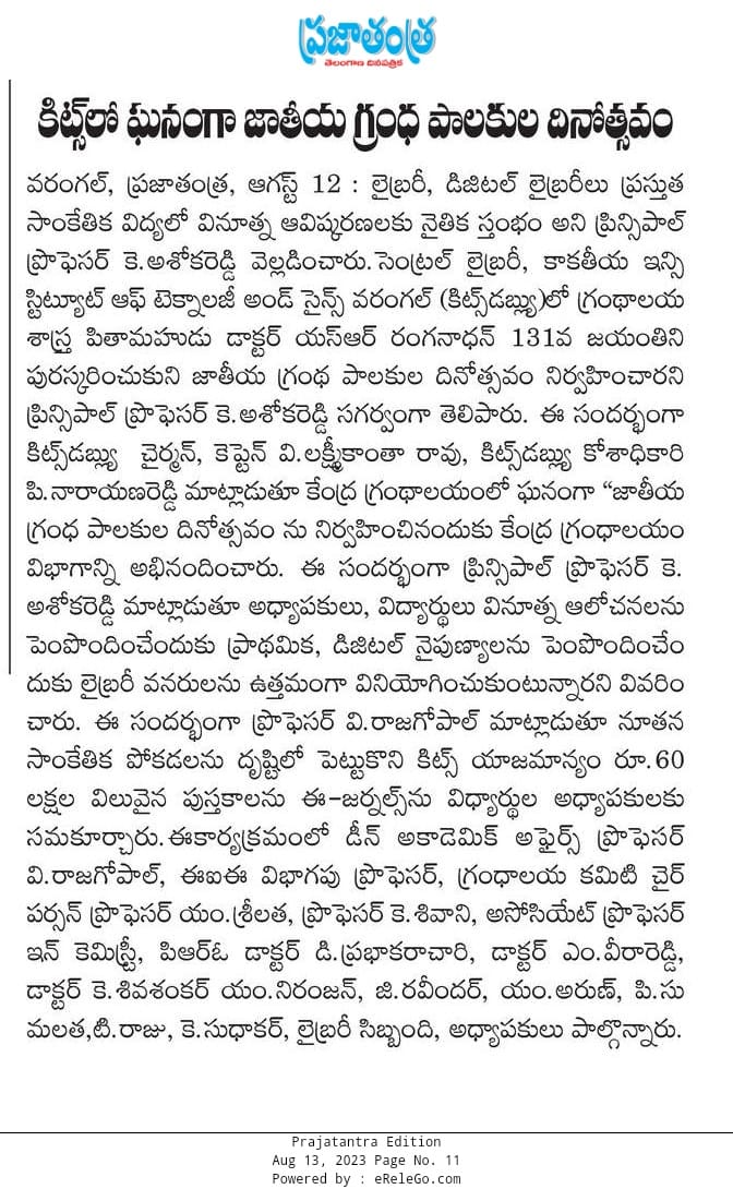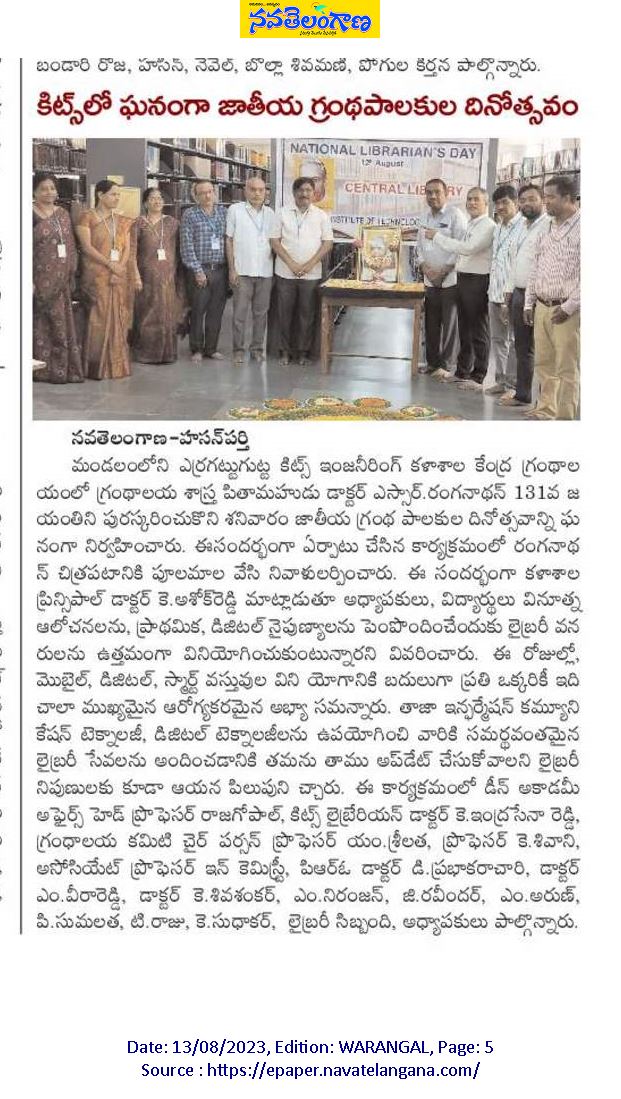 Central Library, KITS-W is celebrated National Librarians Day marking the 131st birth anniversary of Dr.S.R.Ranganathan on 12th August, 2023.