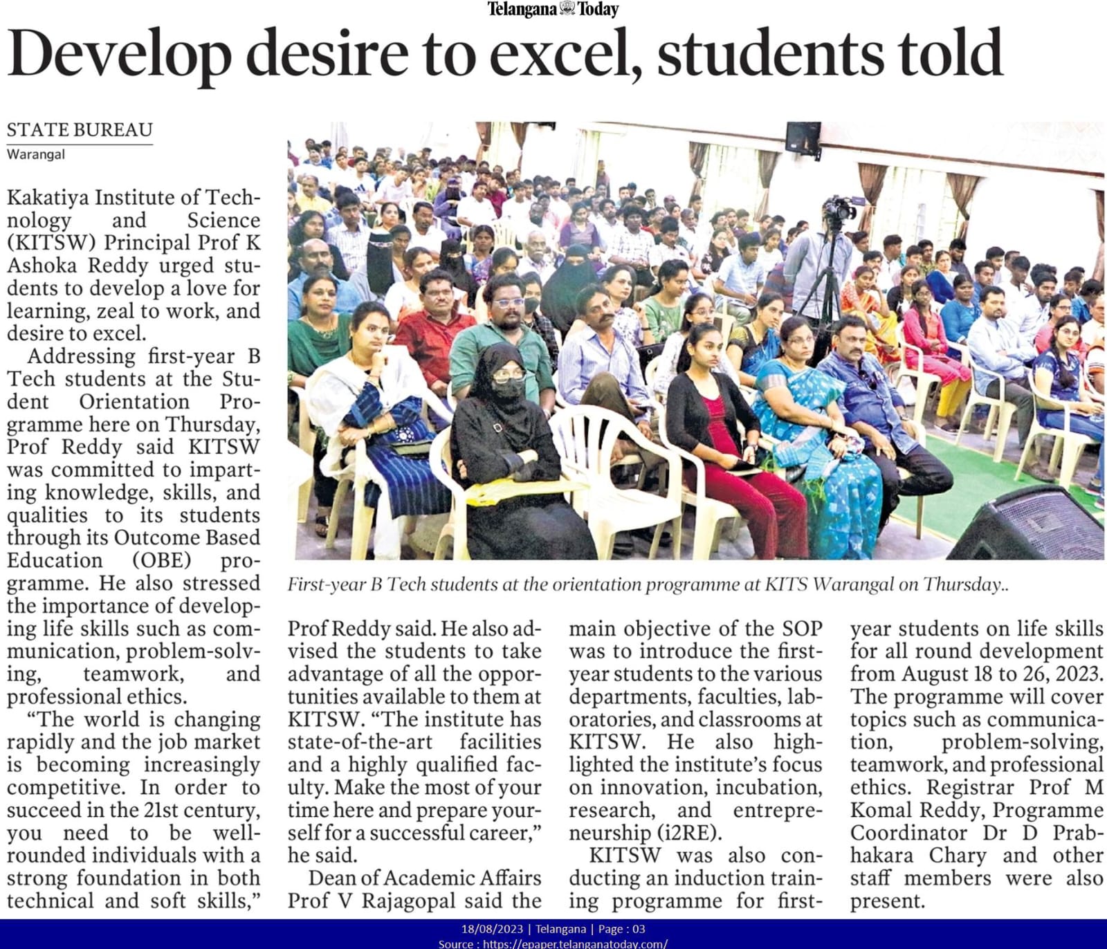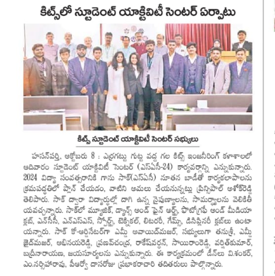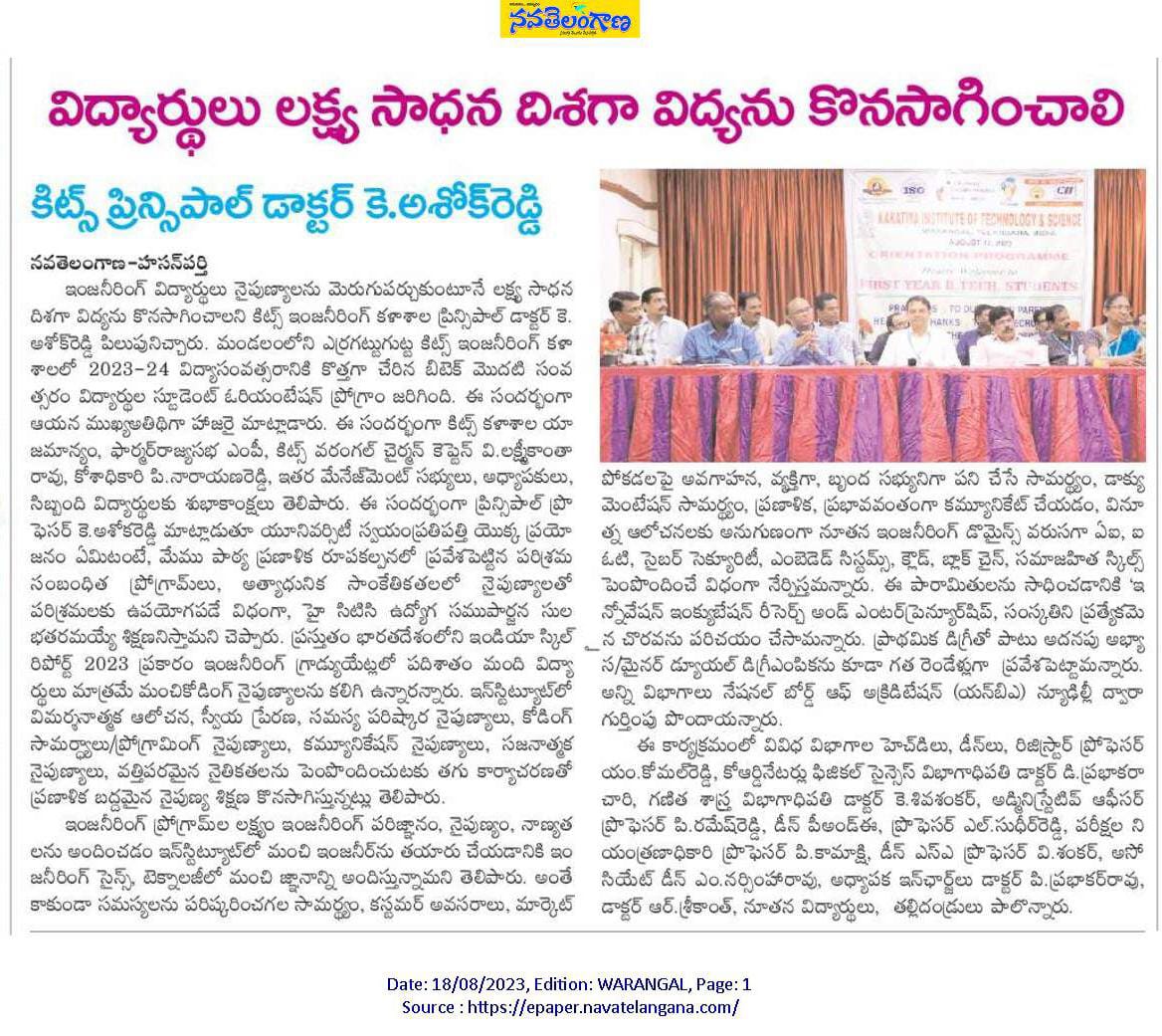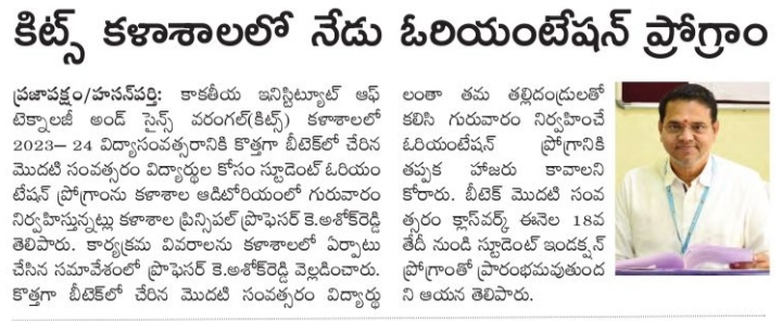 Student Orientation Programme for B.Tech. I year students is held on 17th August, 2023 @ KITSW