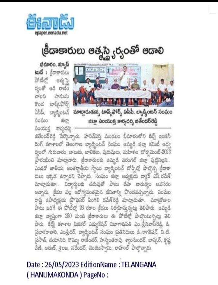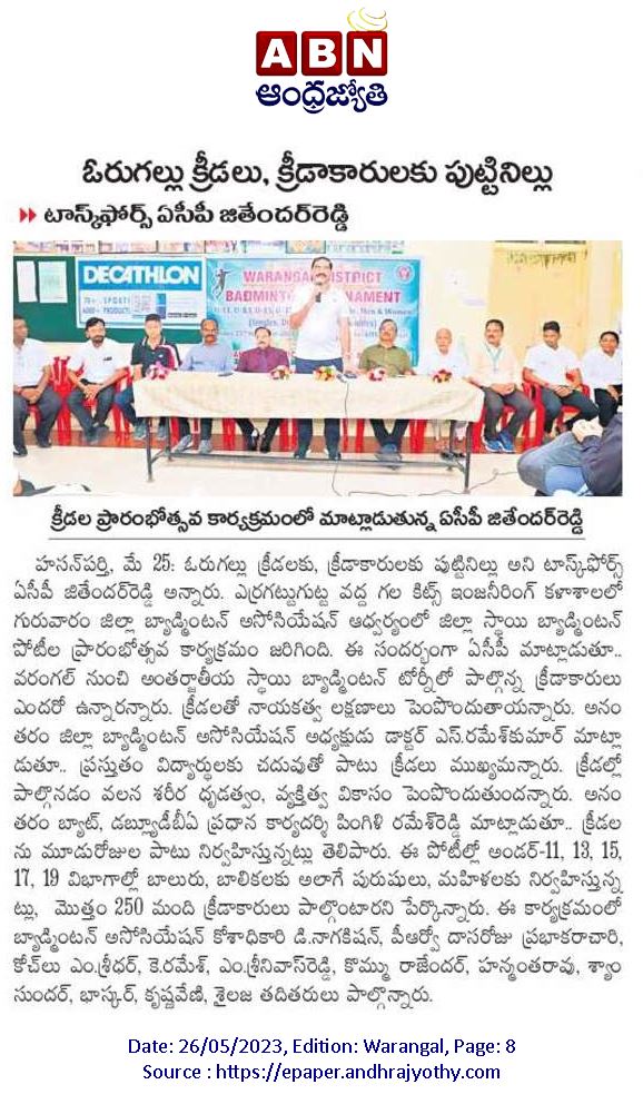 The three-day district badminton championship for boys, girls, men and women got underway at the Indore stadium, KITS, Warangal, during 25th - 27th May, 2023.