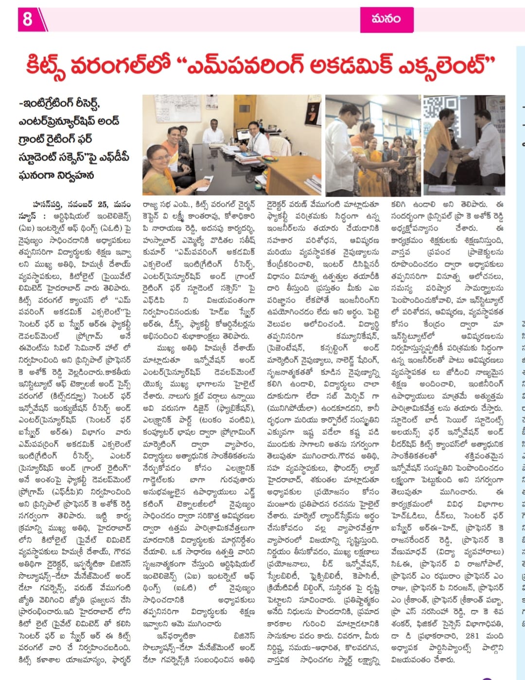 Centre for IIRE, KITSW organised One day Faculty Development Programme(FDP) on "Empowering Academic Excellence Integrating Research, Enterpreneurship and Grant Writing for Student Success" on 25th November, 2023 @ KITS, Warangal