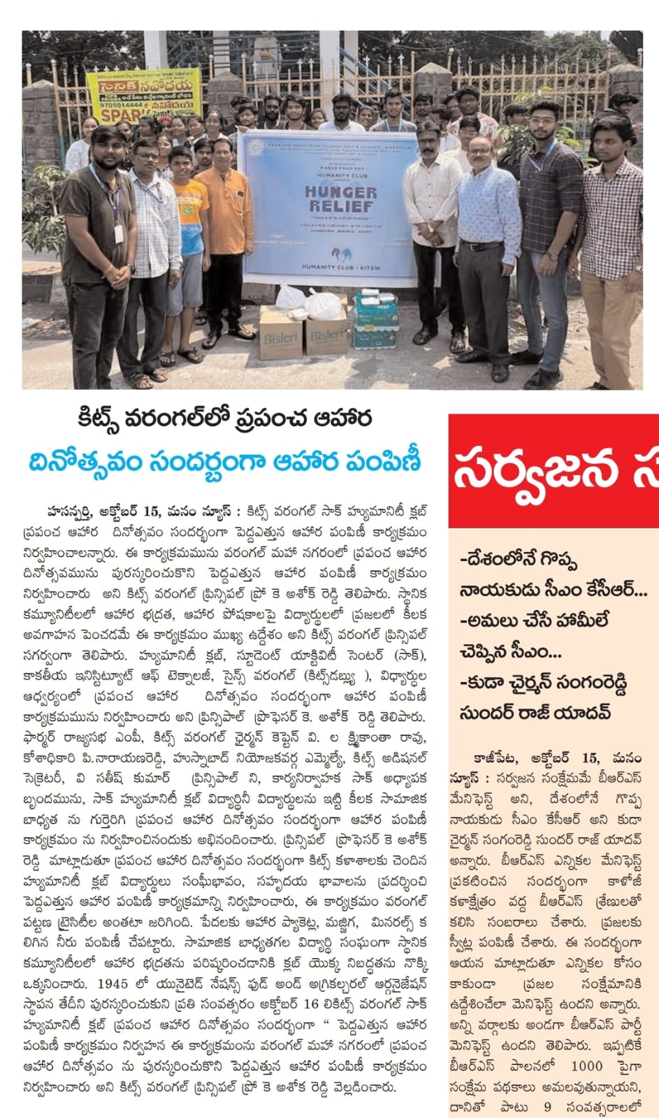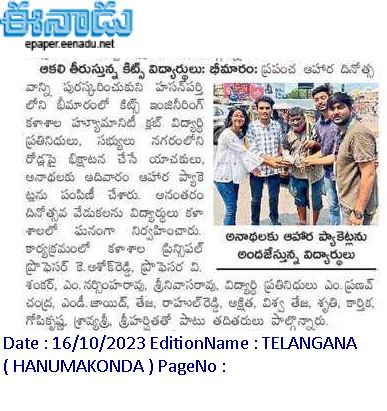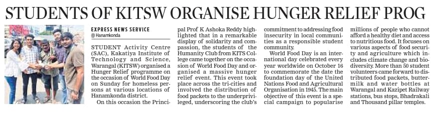 Student Activity Centre(SAC), KITSW organised a "Hunger Relief" programme on the occasion of World Food Day on 15th October, 2023 @ KITS, Warangal