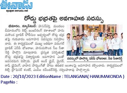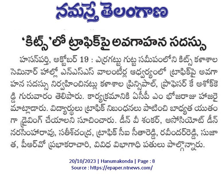 NSS, Student Activity Centre(SAC), KITSW organised a "Traffic Awareness Session" programme in association with Hanamkonda City Traffic Police on 19th October, 2023 @ KITS, Warangal