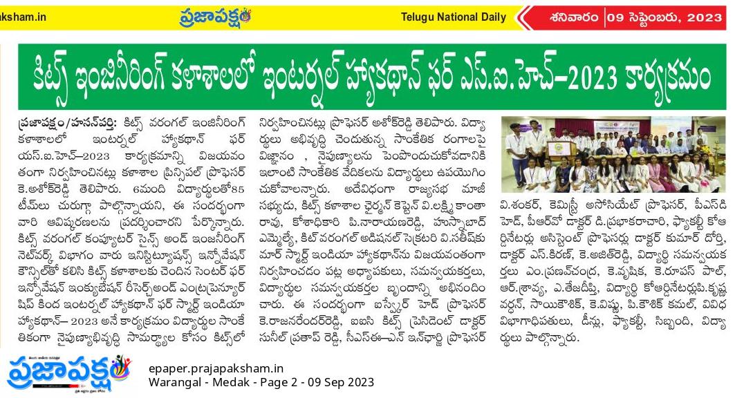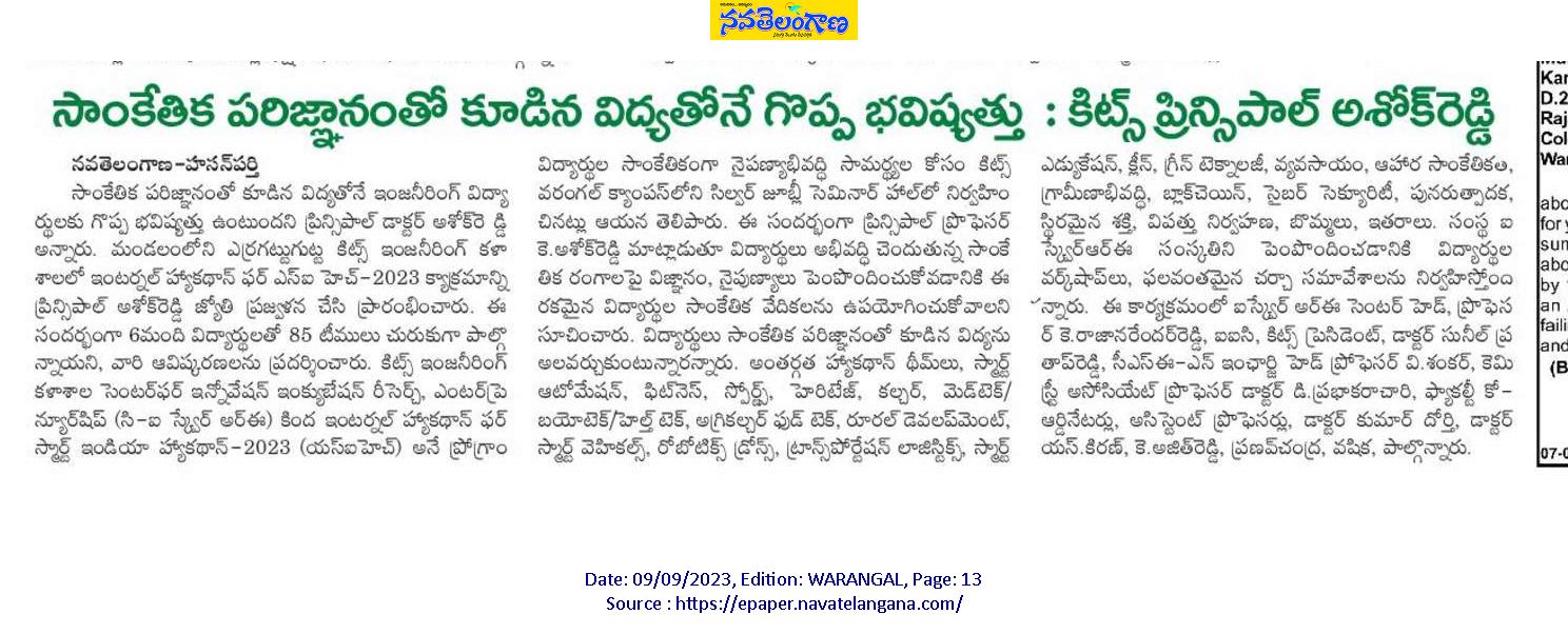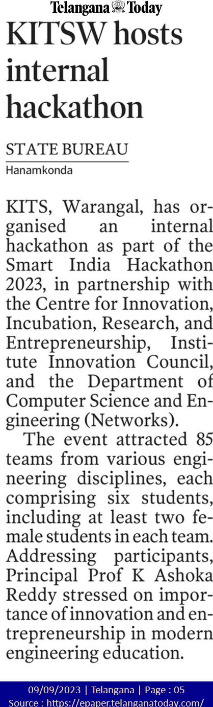 I2RE and Dept. of CSE(Networks) jointly organised "Internal Hackathon for Smart India Hackathon-2023" on 8th September, 2023 @ KITS, Warangal