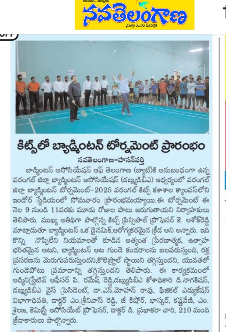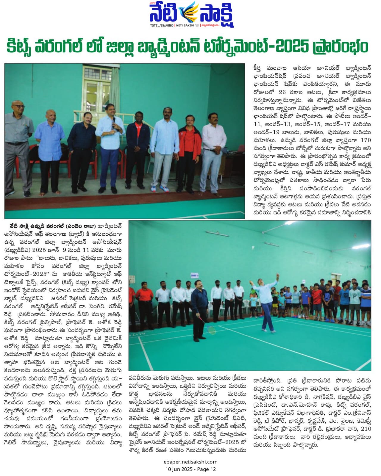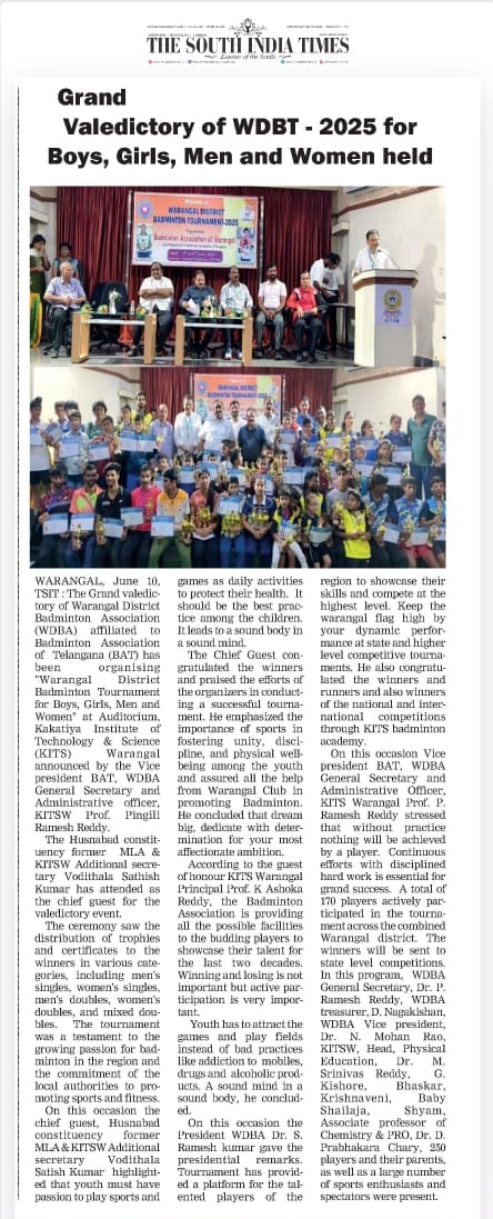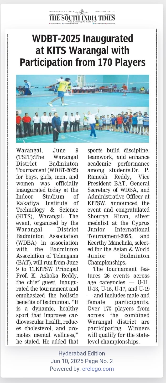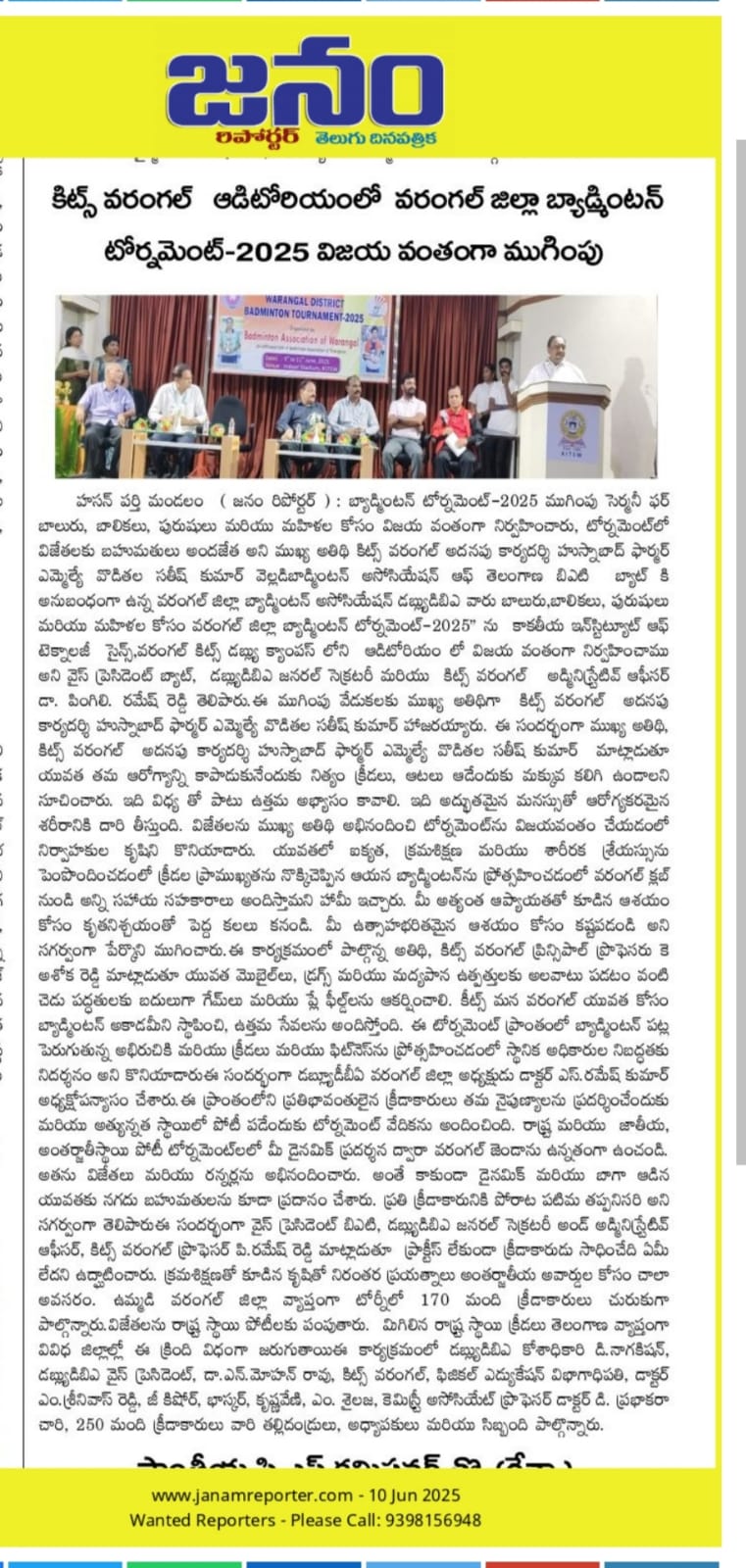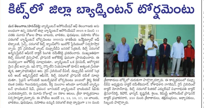 Warangal District Badminton Tournament(WDBT-2025) for boys, girls, men and womens was inaugurated on 9th June, 2025 @ KITS, Warangal.