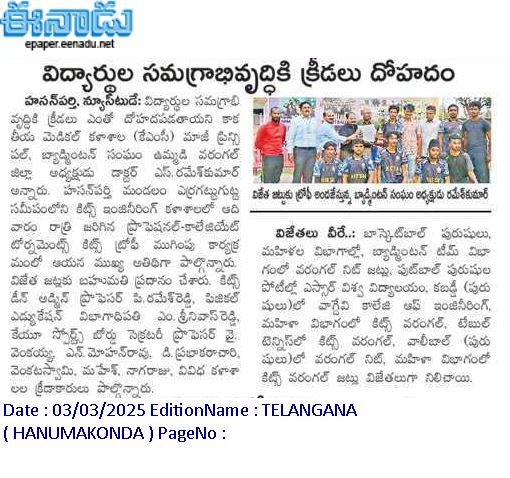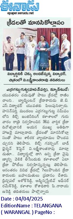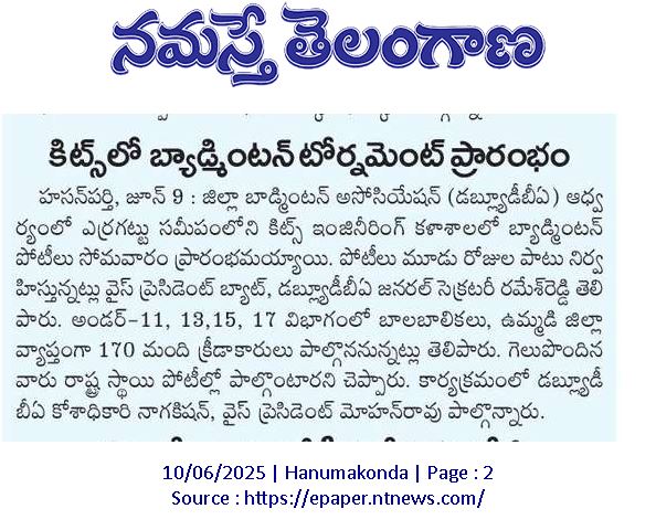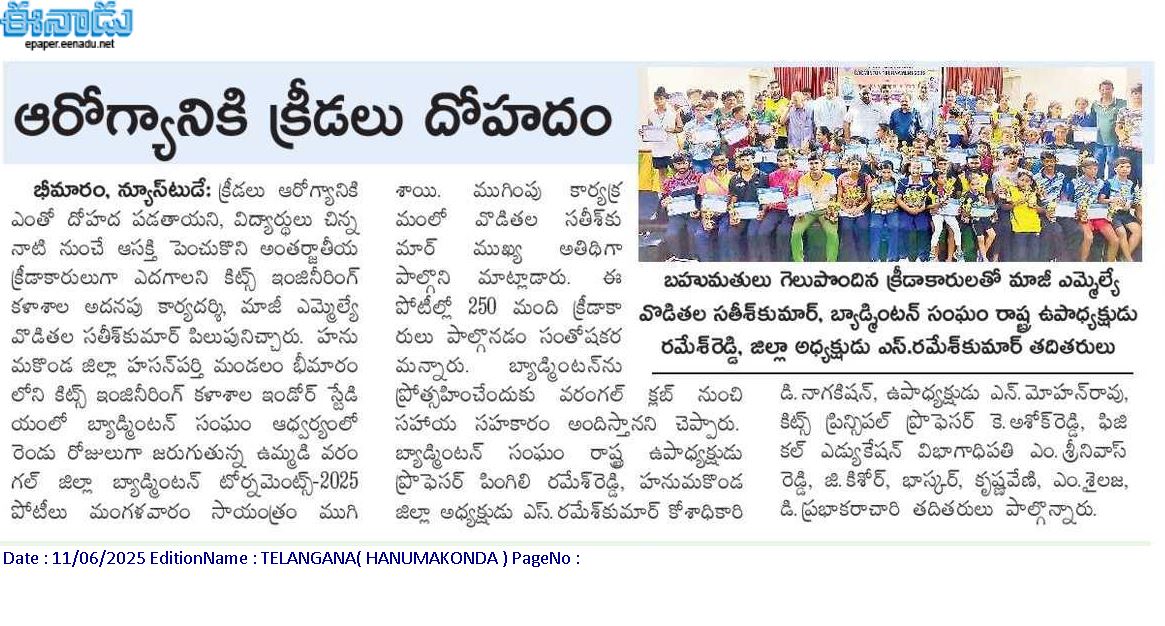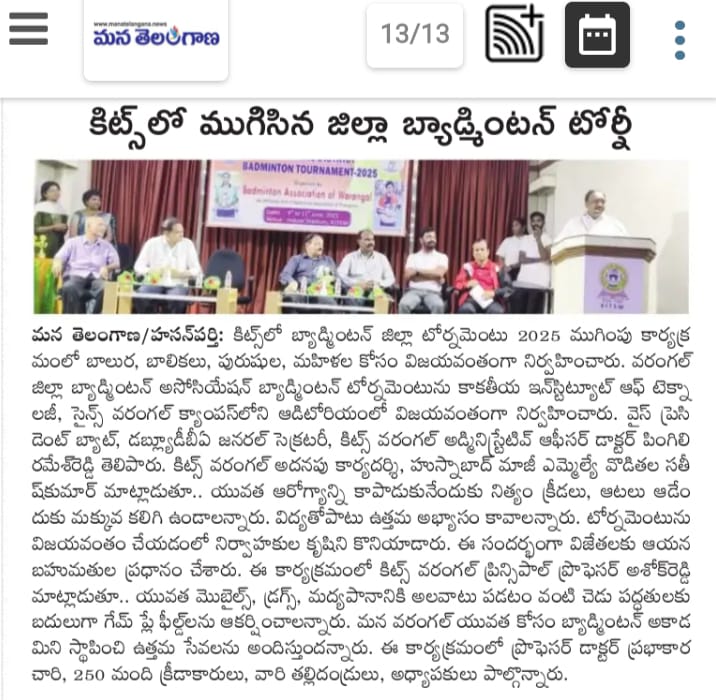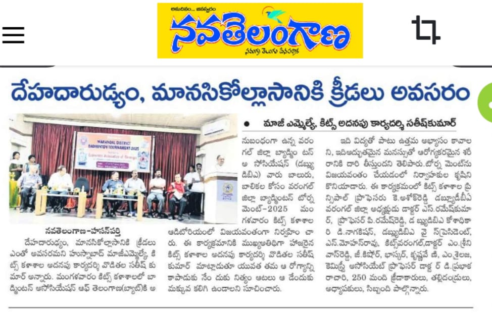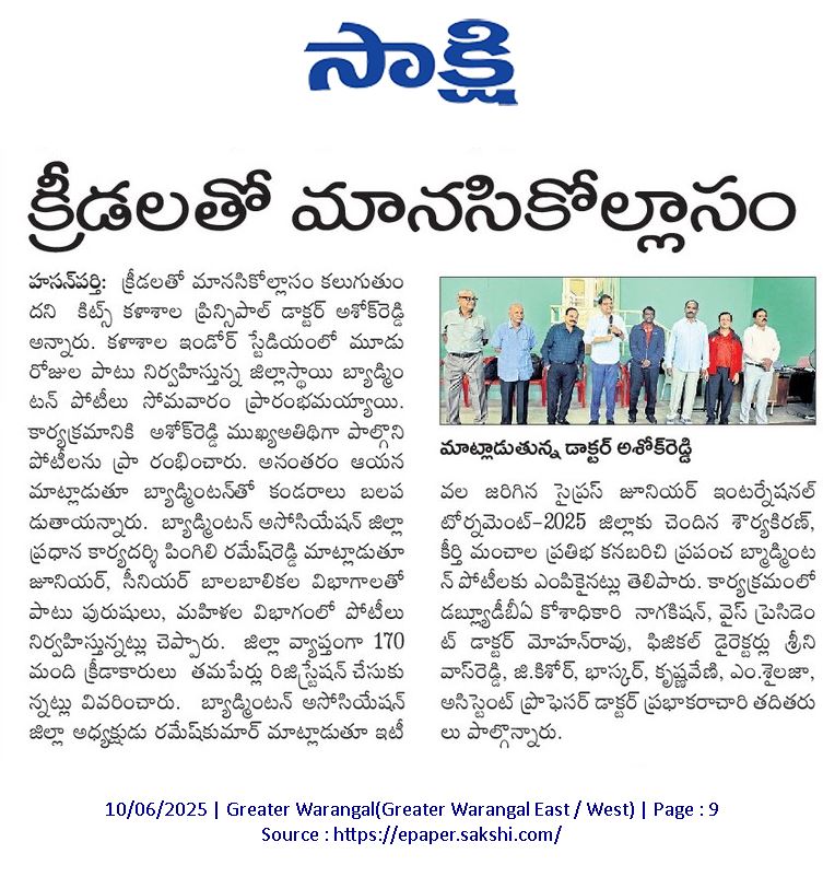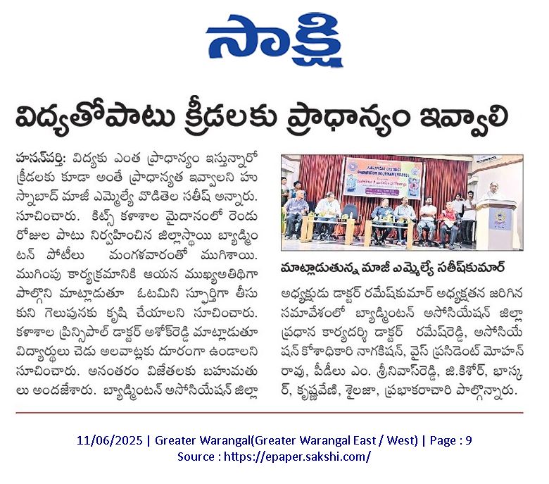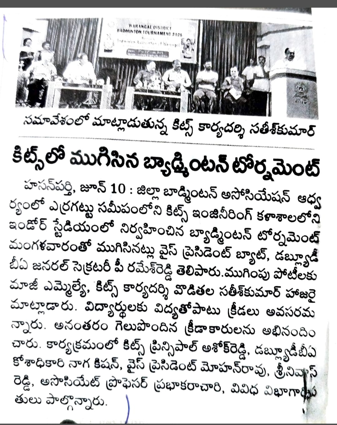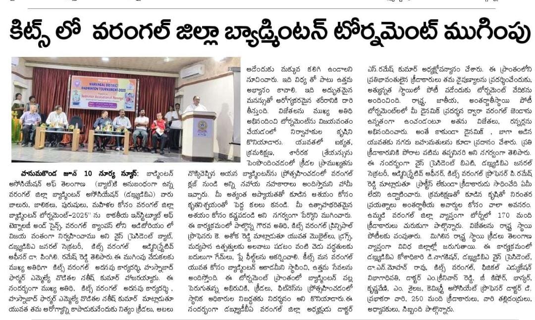 Warangal District Badminton Tournament(WDBT-2025) for boys, girls, men and womens was inaugurated on 9th June, 2025 @ KITS, Warangal.
