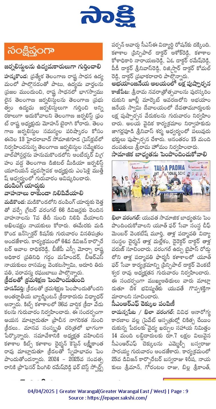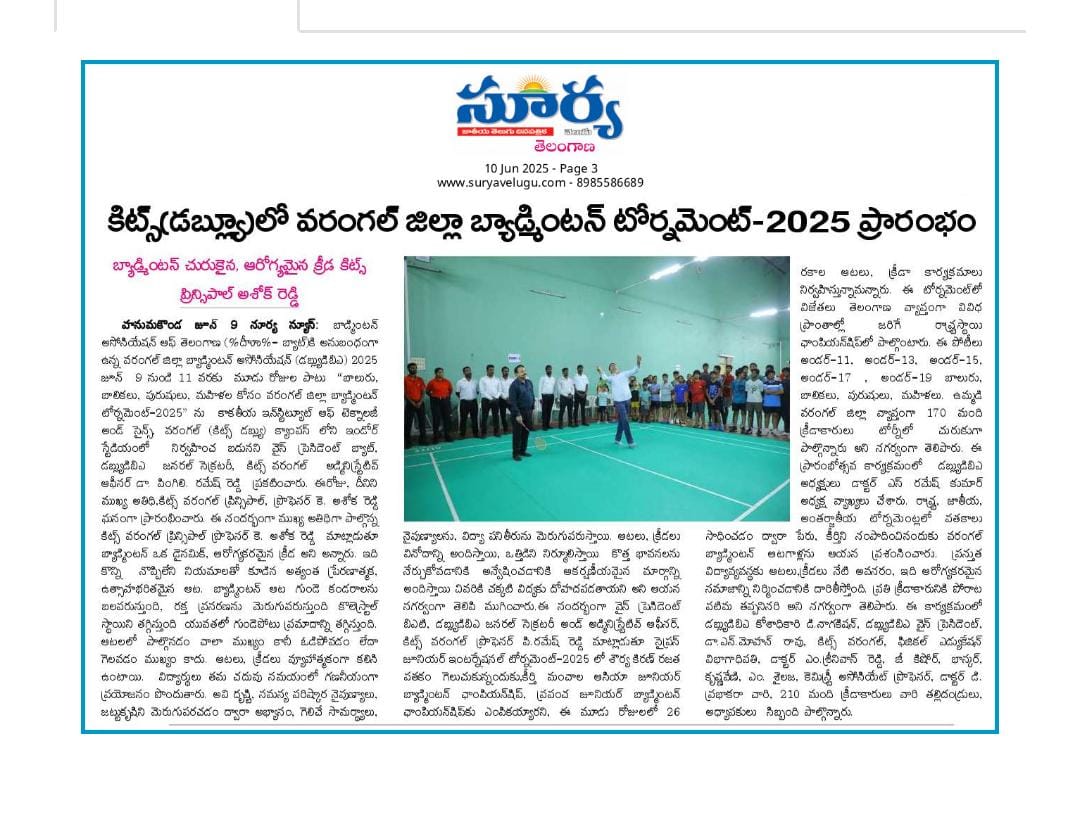 The Warangal District Badmintion Tournament-2025 for Boys, Girls, Men and Women will be held from June 9th to 11th, 2025 @ Indoor Stadium, KITS, Warangal.
