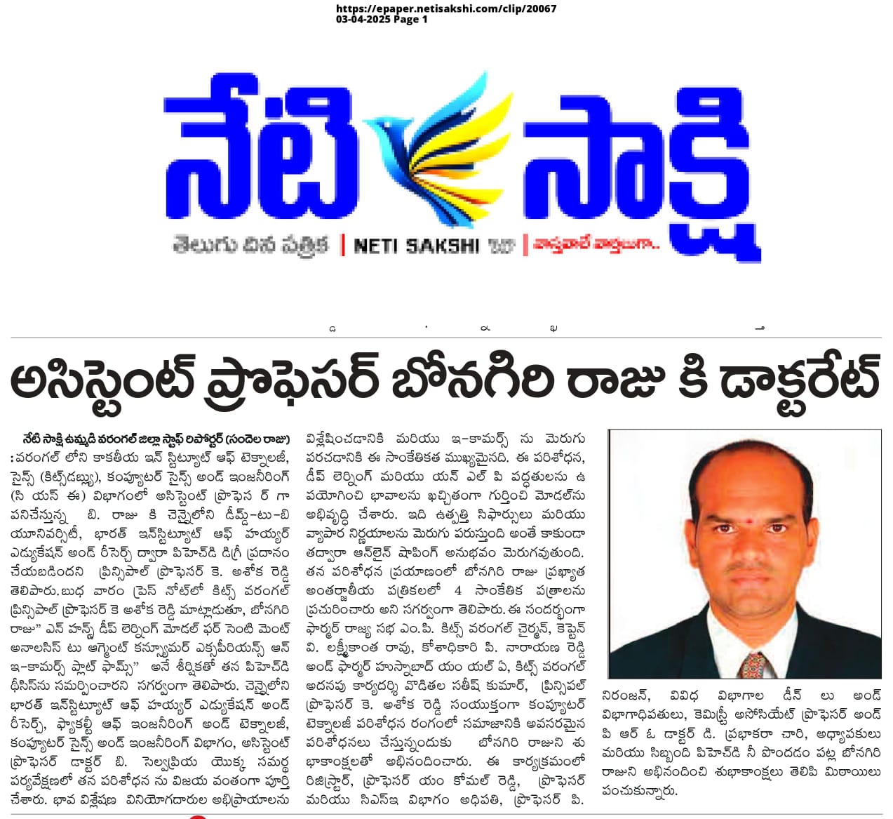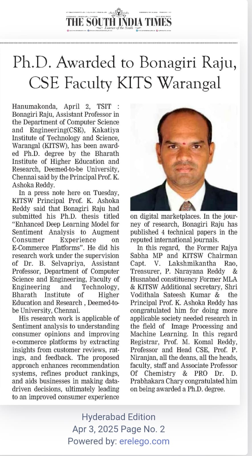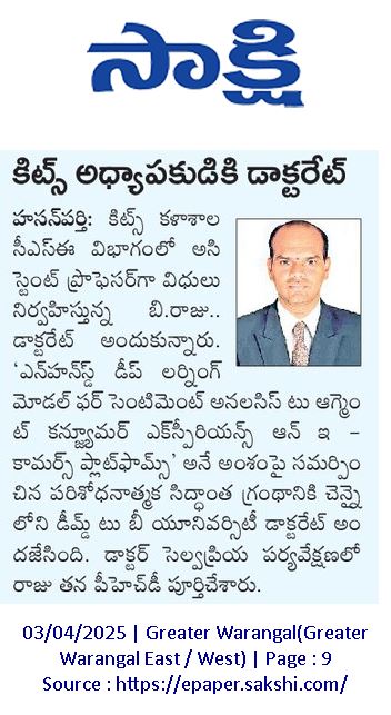 Sri Bonagiri Raju, Assistant Professor in the Department of Computer Science and Engineering(CSE) has been awarded Ph.D. degree by the Bharath Institute of Higher Education and Research(BIHER) deemed-to-be-university, Chennai, Tamilnadu for his thesis "Enhanced Deep Learning Model for Sentiment Analysis to Augment Consumer Experience on E-Commerce platforms".