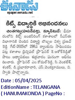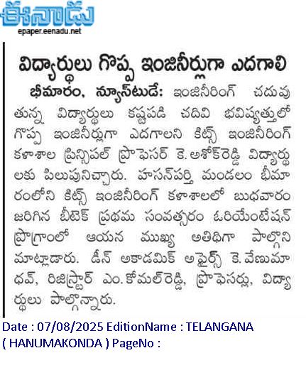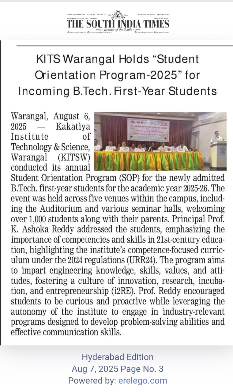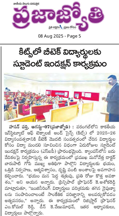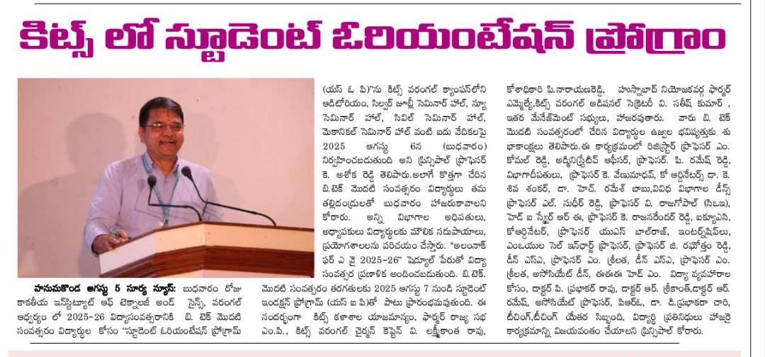 KITS, Warangal conducted "Student Orientation Program-2025" for the newly admitted B.Tech. I Year students for the academic year 2025-26.