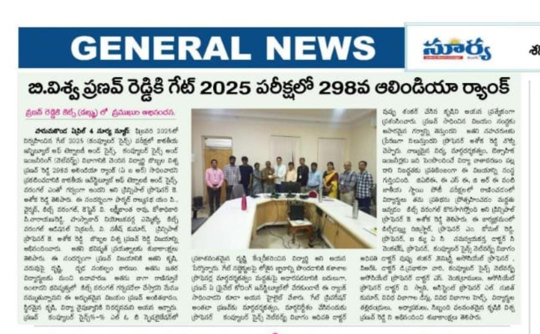 B.Tech. Computer Science and Engineering (Internet of Things) student Mr. Bobbala Vishwa Pranav Reddy secured AIR 298 in GATE CS 2025!.