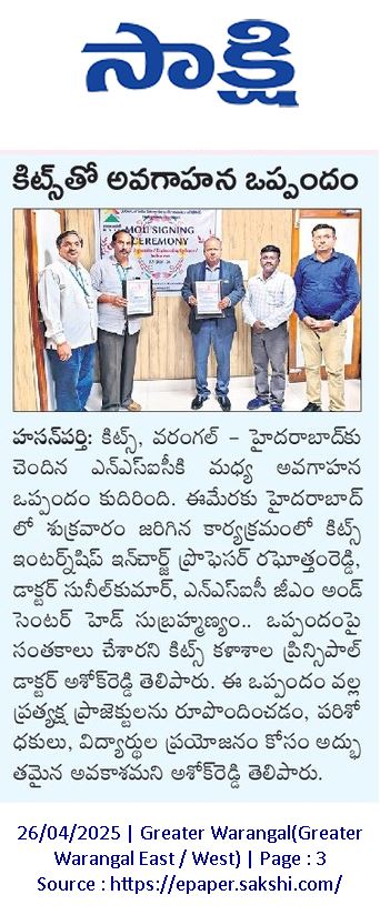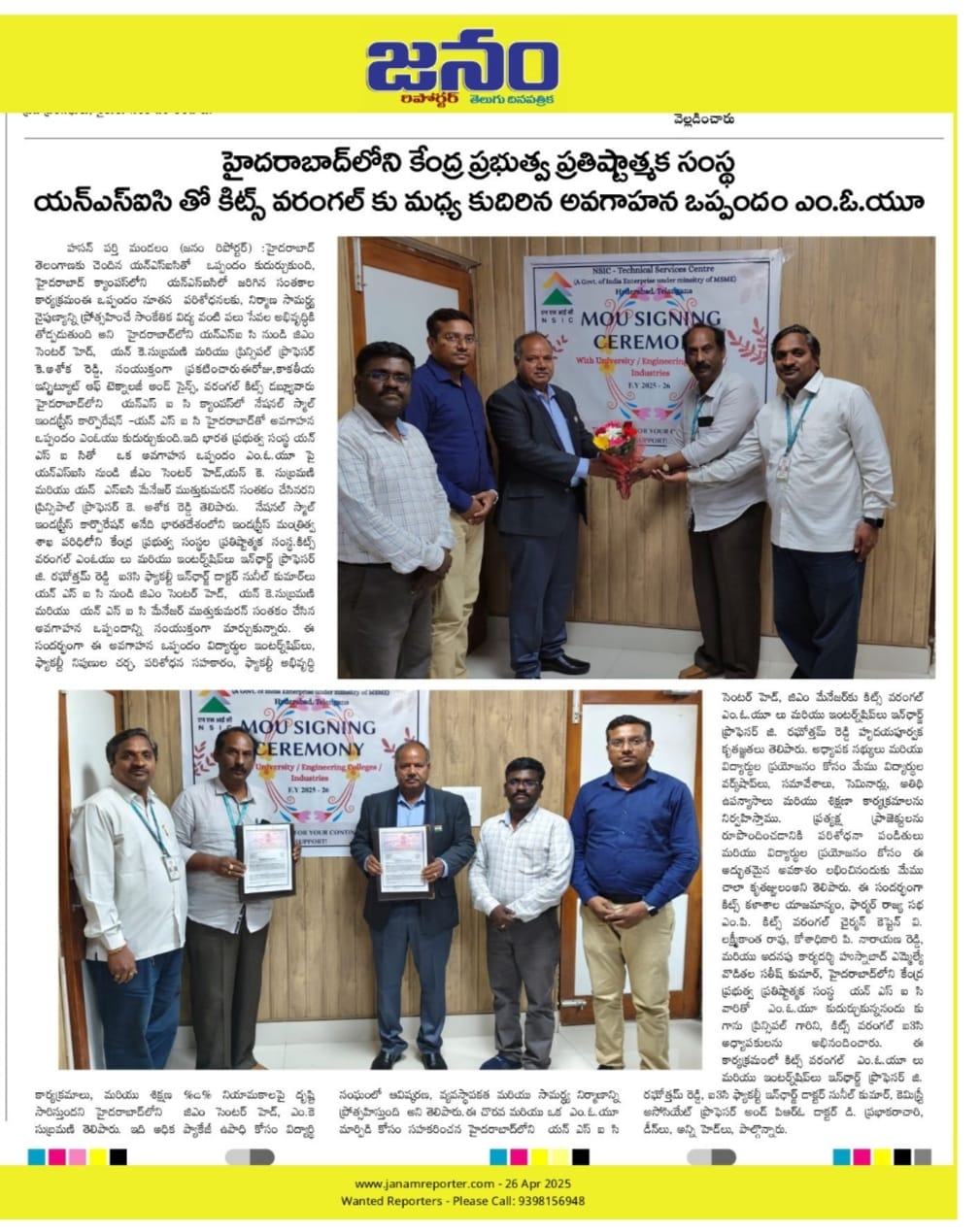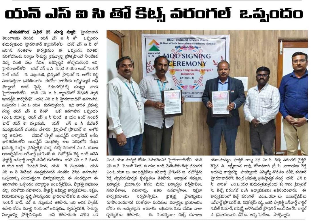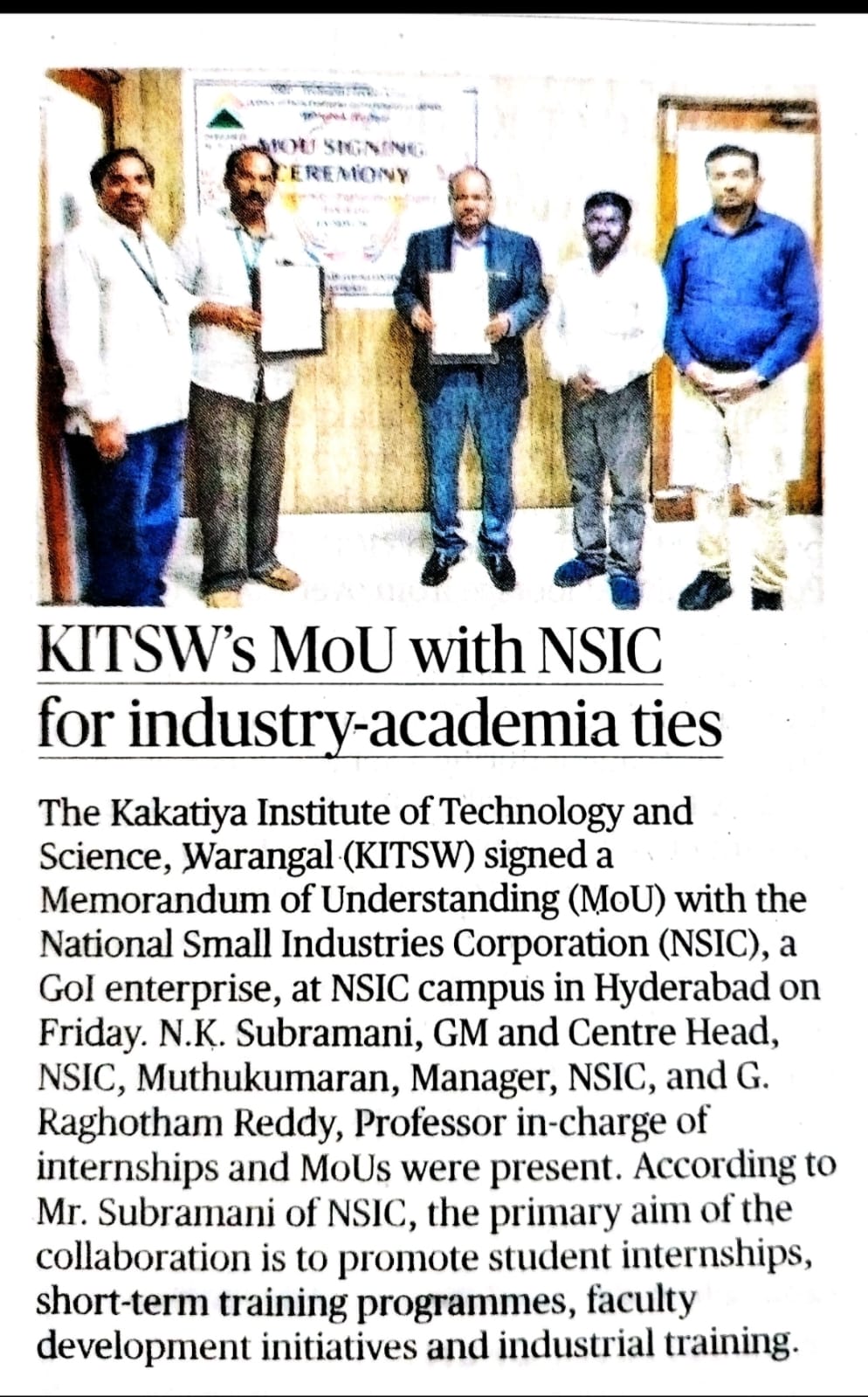 KITS, Warangal is Memorandum of Understanding(MoU) with National Small Industries Corporation(NSIC), Hyderabad on 25th April, 2025 at NSIC campus, Hyderabad.