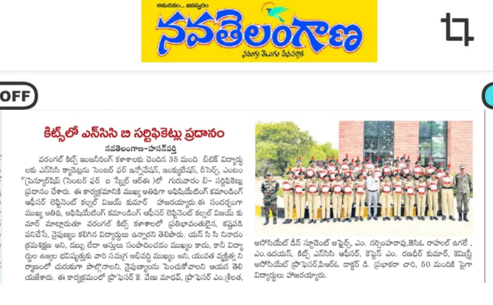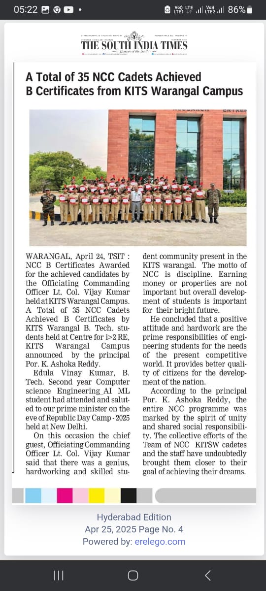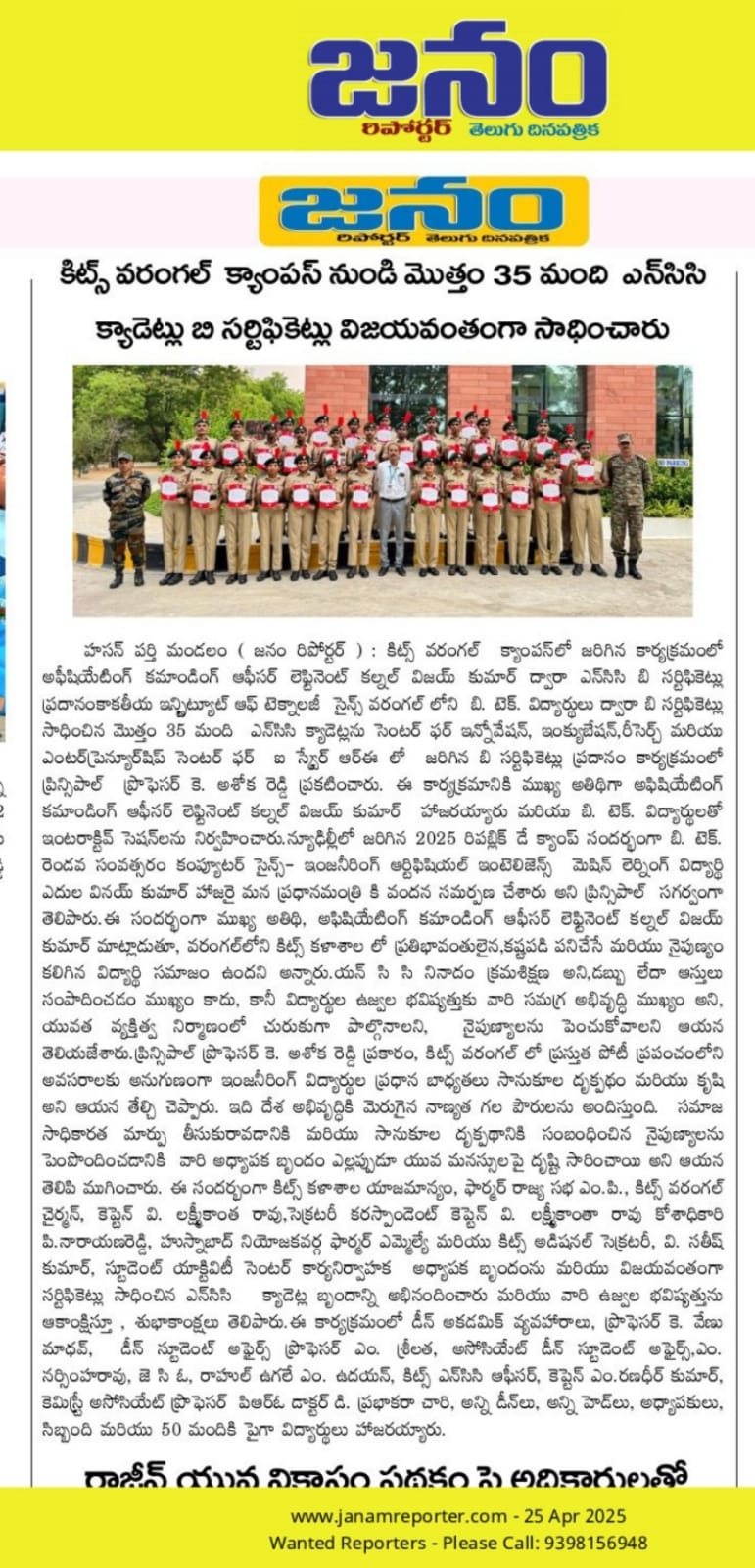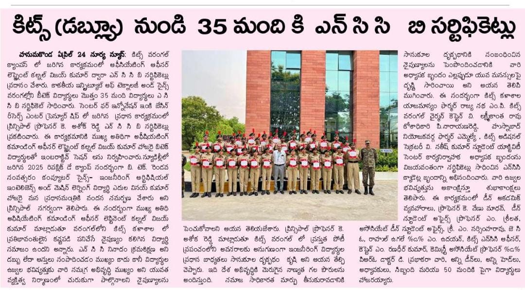 A Total of 35 NCC Cadets achieved B Certificates from KITS, Warangal campus on 24th April, 2025.