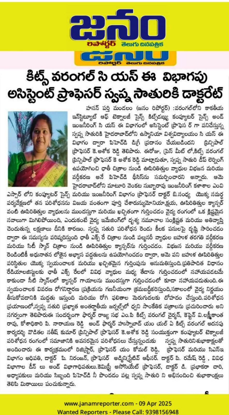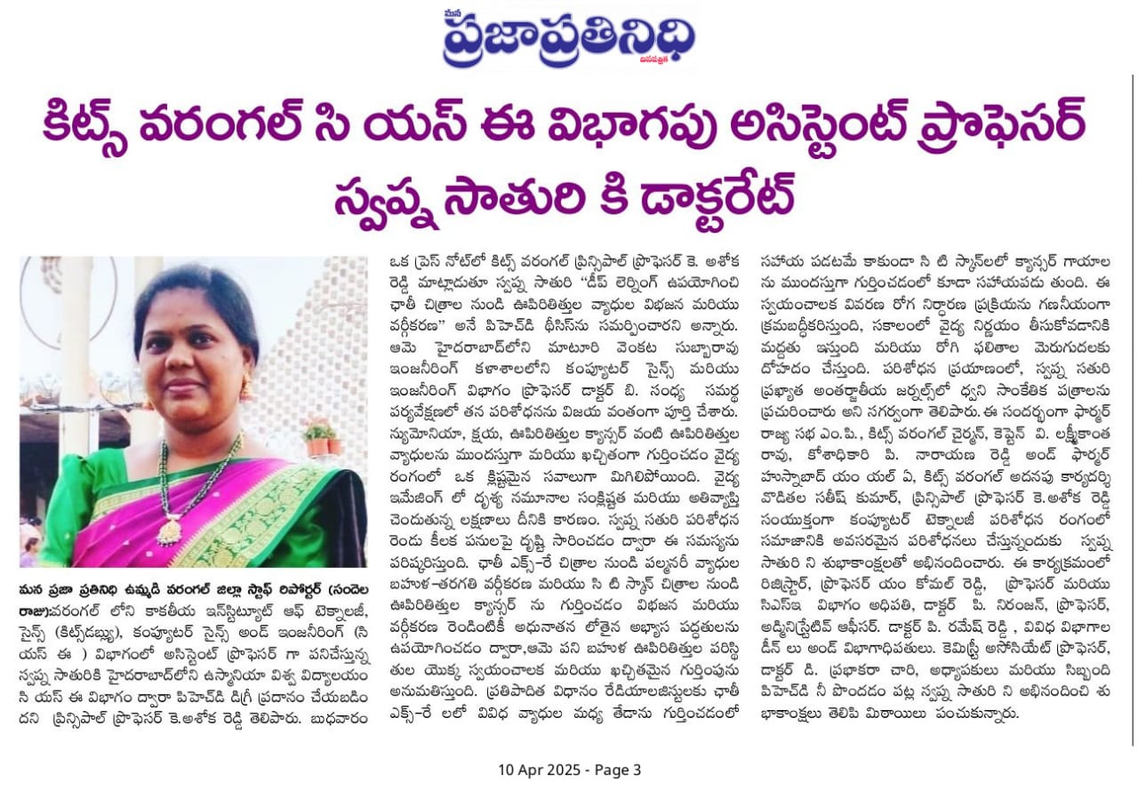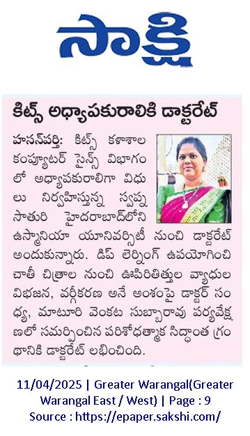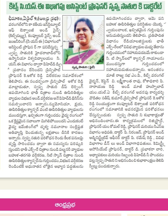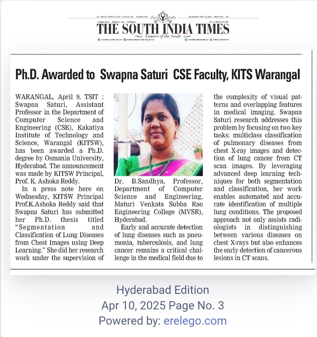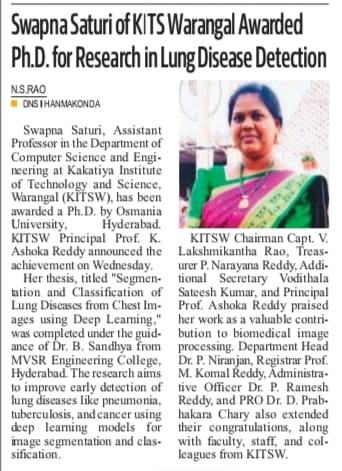 Smt. S.Swapna, Assistant Professor in the Department of Computer Science and Engineering(CSE) has been awarded Ph.D. degree by Osmania University, Hyderabad, Telangana for his thesis, titled "Segmentation and Classification of Lung Diseases from Chest Images using Deep Learning" under the Guidance of Dr.B.Sandhya Rani from MVSR Engineering College, Hyderabad.