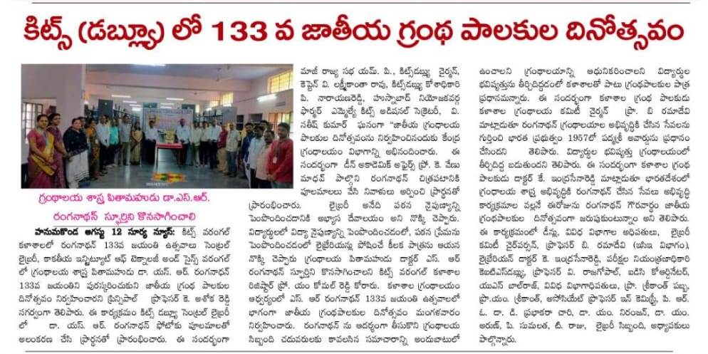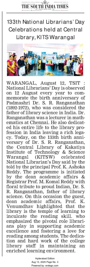 Central Library, KITW celebrated 133th National Librarians' Day on 12th August, 2025 @ KITS, Warangal.