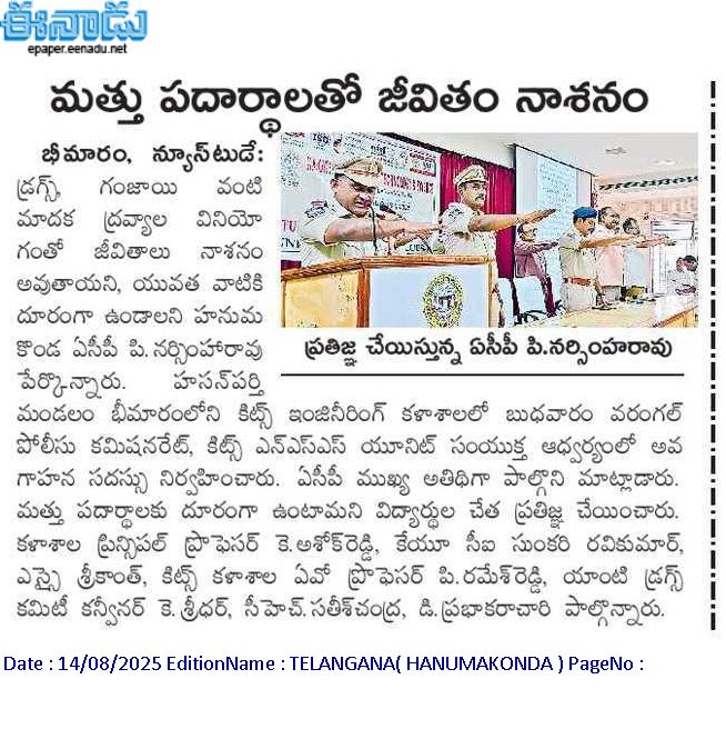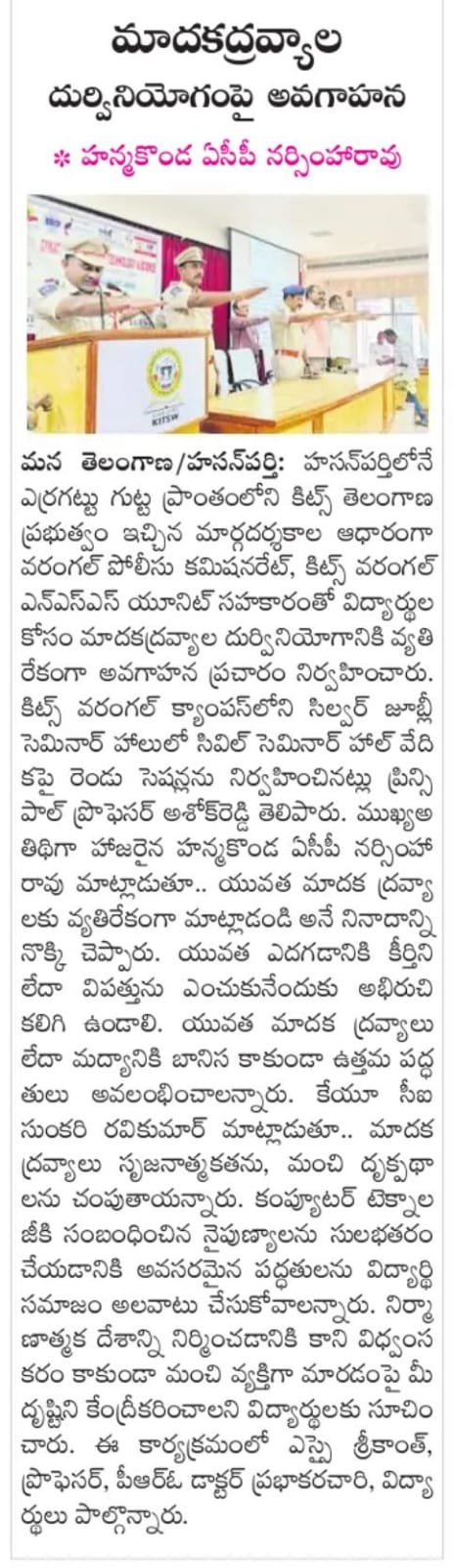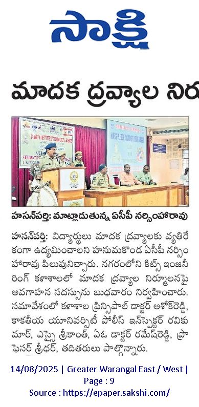 As per Telangana State Govenment Guidelines NSS, KITSW and Warangal Police Commissionerate jointly organized "Anti Drug Awareness Programme" on 12th August, 2025 @ KITS, Warangal.