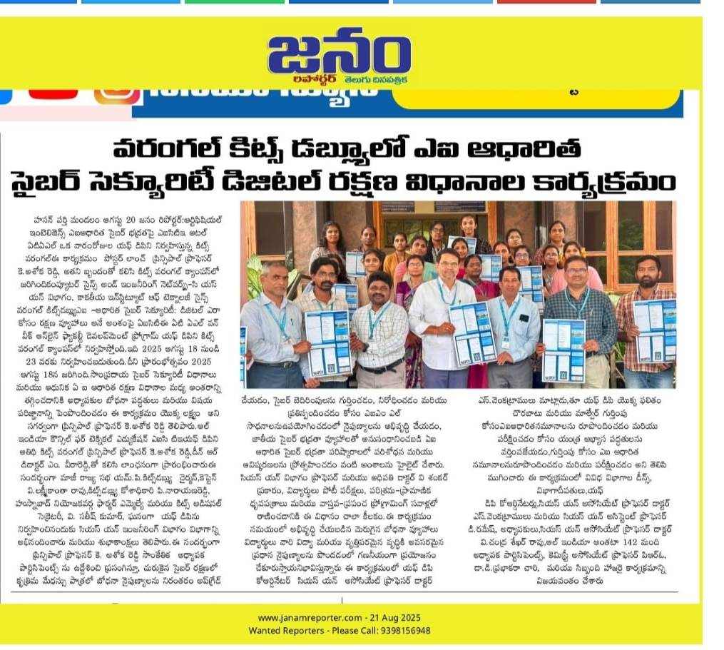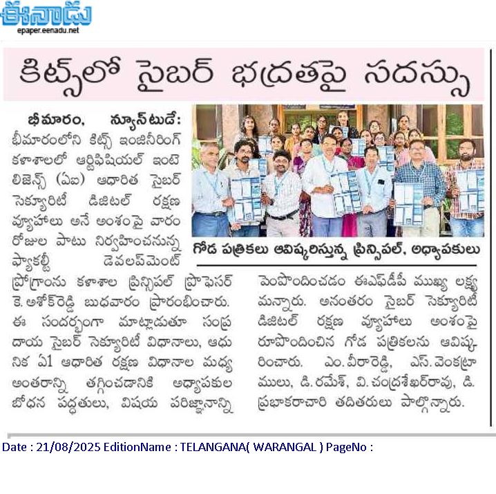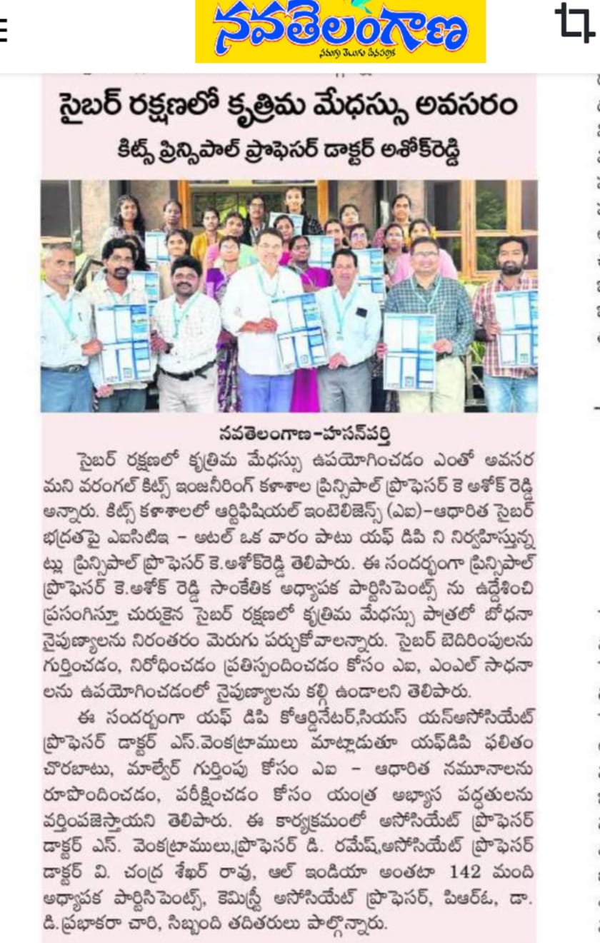 KITS, Warangal organized a one-week AICTE-ATAL Faculty Development Programme(FDP) on AI-Driven Cyber Security" August 18-23, 2025.