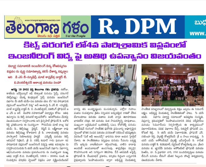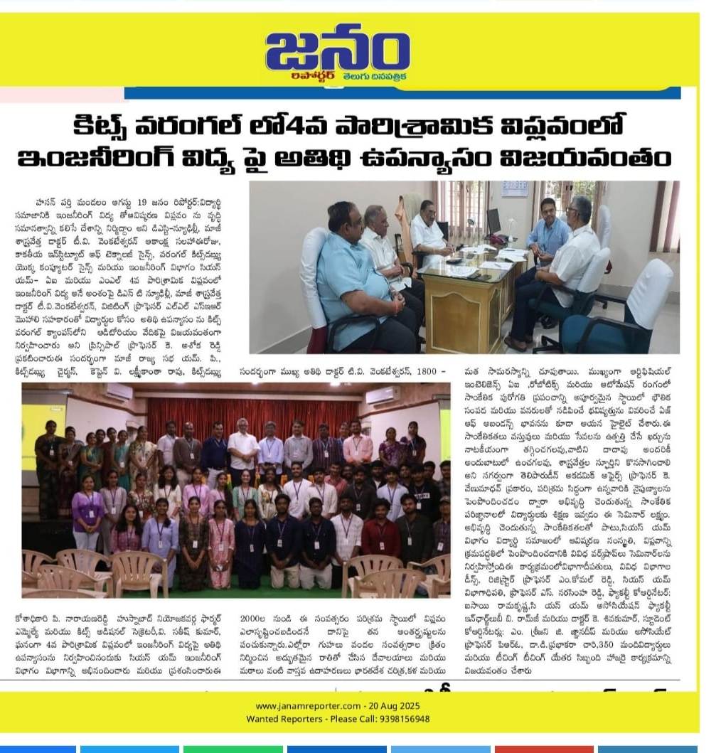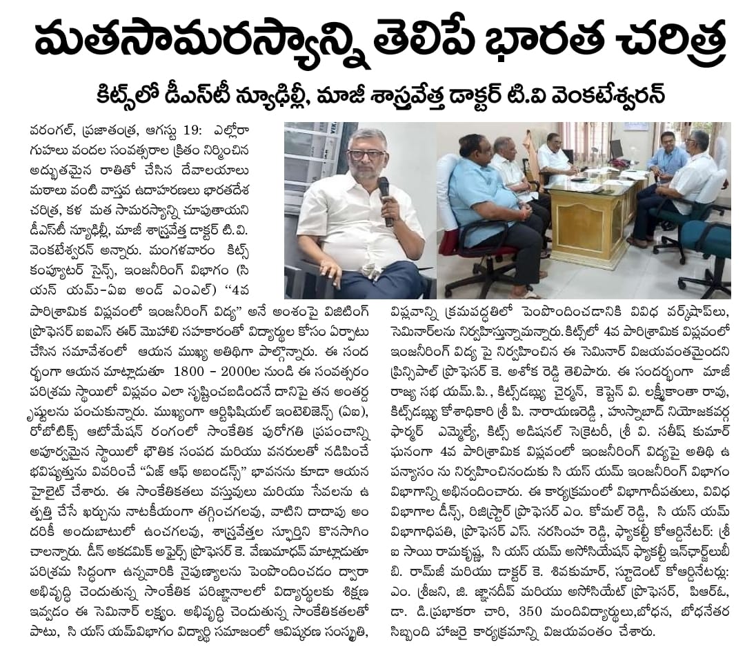 The Chief Guest, Dr. T.V. Venkateswaran — a faculty member at IISER Mohali and former Scientist F and Division Head at Vigyan Prasar, Department of Science and Technology — addressed the gathering on the topic 'The Fourth Industrial Revolution in Engineering Education' on 19th August 2025 @ KITS, Warangal.