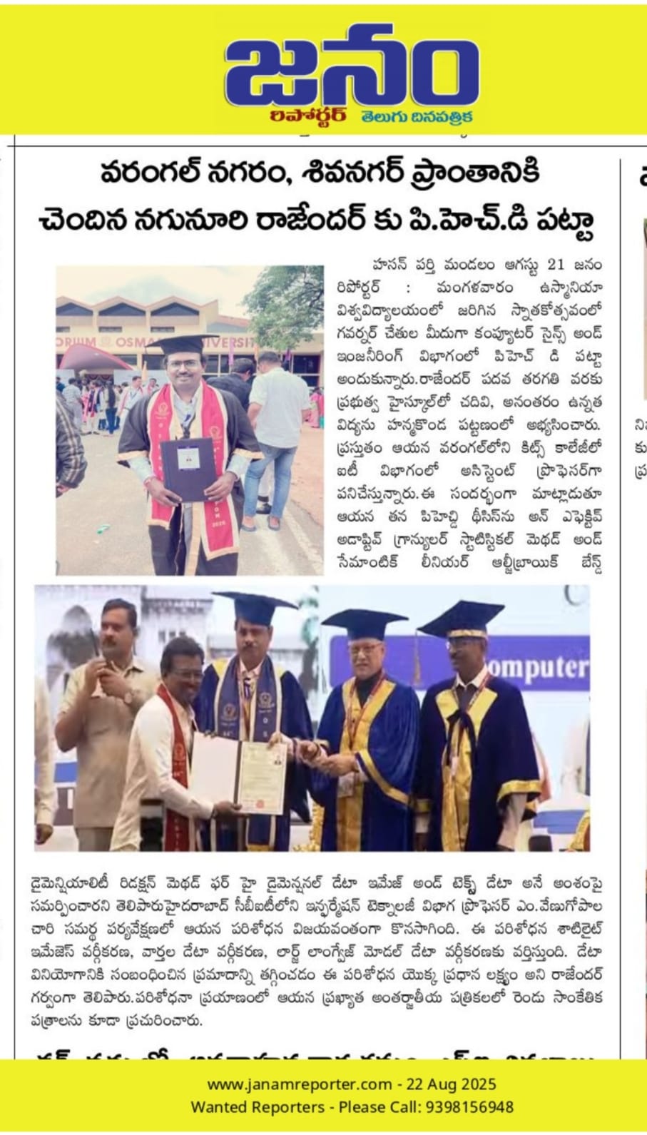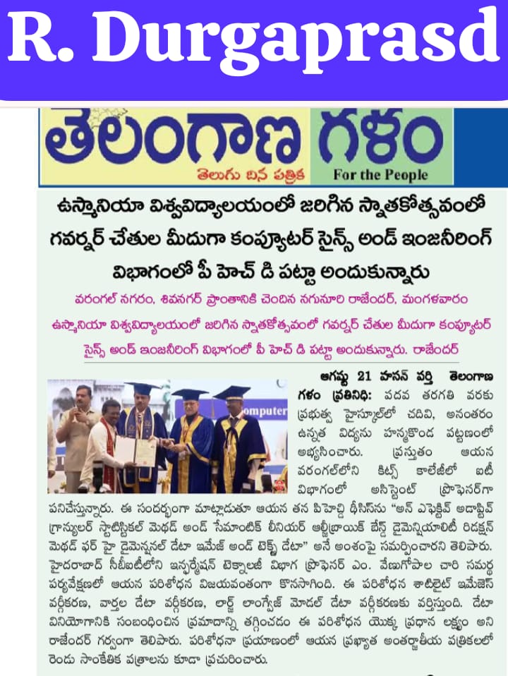 Sri N.Rajender, Assistant Professor in the Department of Information Technology has been awarded Ph.D. degree by Osmania University, Hyderabad under the Guidance of Prof. N.Venugopala Chary, Department of Information Technology, CBIT, Hyderabad.