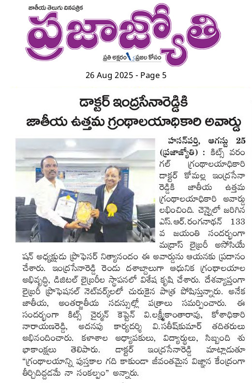 Dr. Komalla Indrasena Reddy, Librarian of Kakatiya Institute of Technology and Science (KITS), Warangal was honoured with the Best Librarian Award by Prof. K.Nityanandam, President, Madras Library Association, Chennai on 24th August, 2025 at Anna Centenary Library, Chennai.