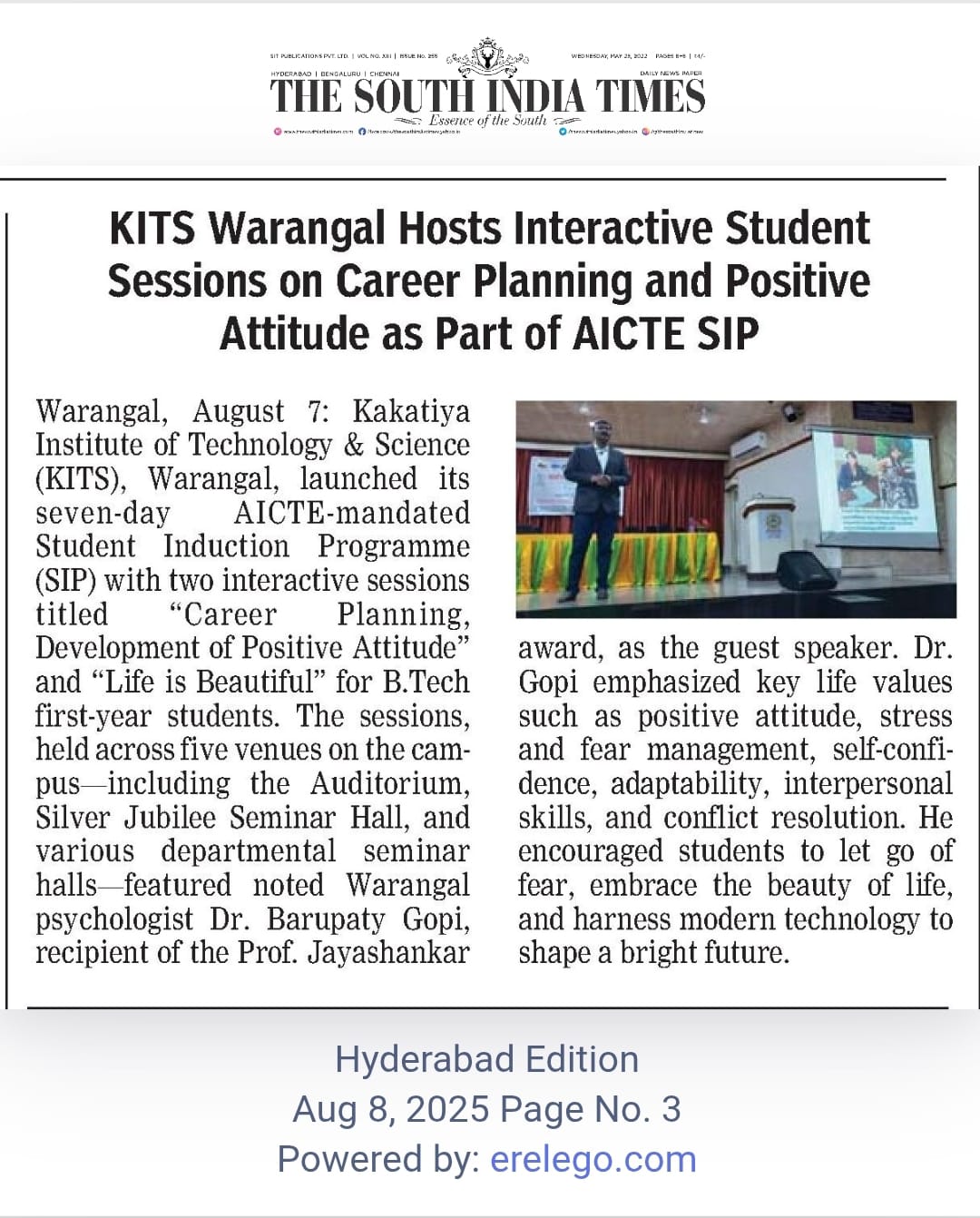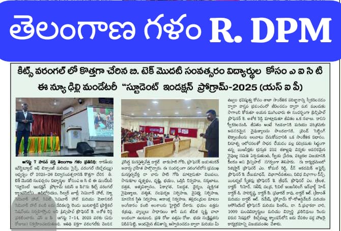 KITS, Warangal conducted a seven day AICTE-mandated "Student Induction Program(SIP)" with two interactive sessions titled "Career Planning, Development pf Positive Attituted" aand "Life is Beautiful" for the newly admitted B.Tech. I Year students.