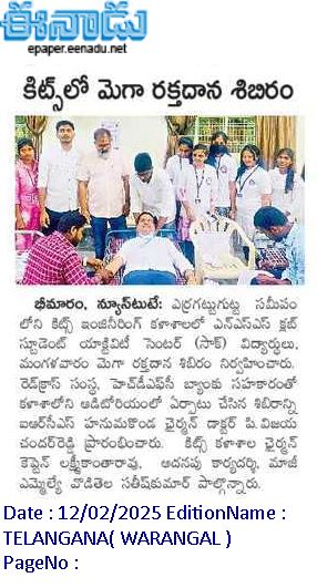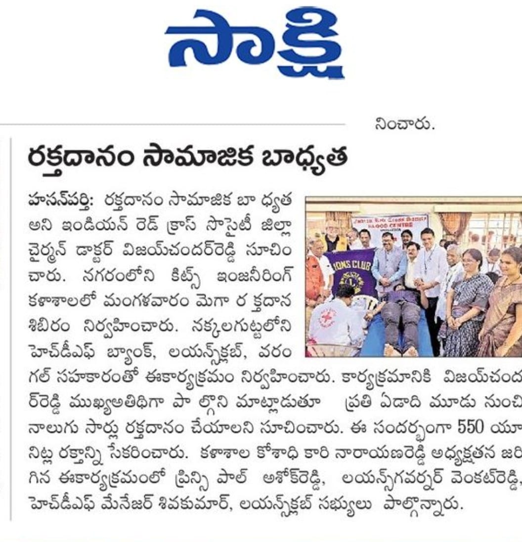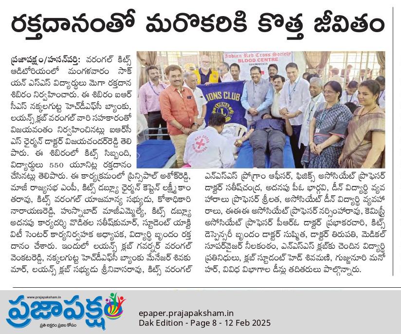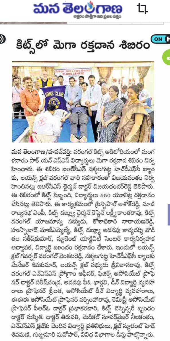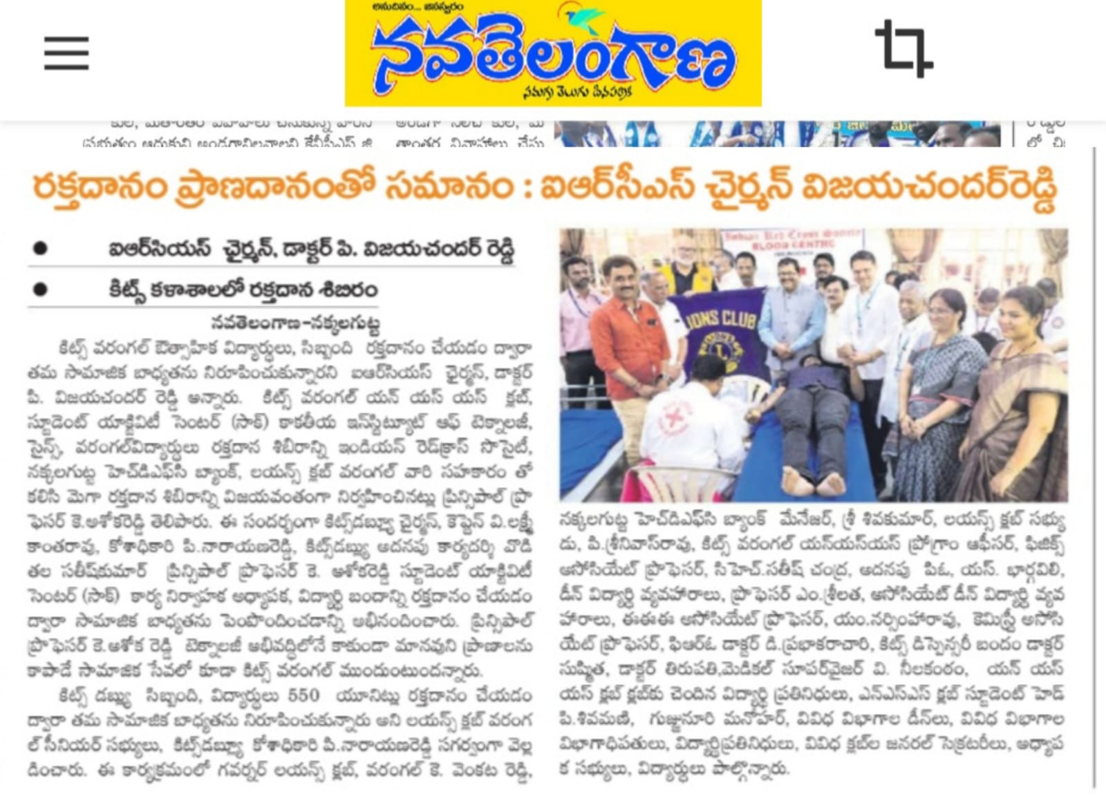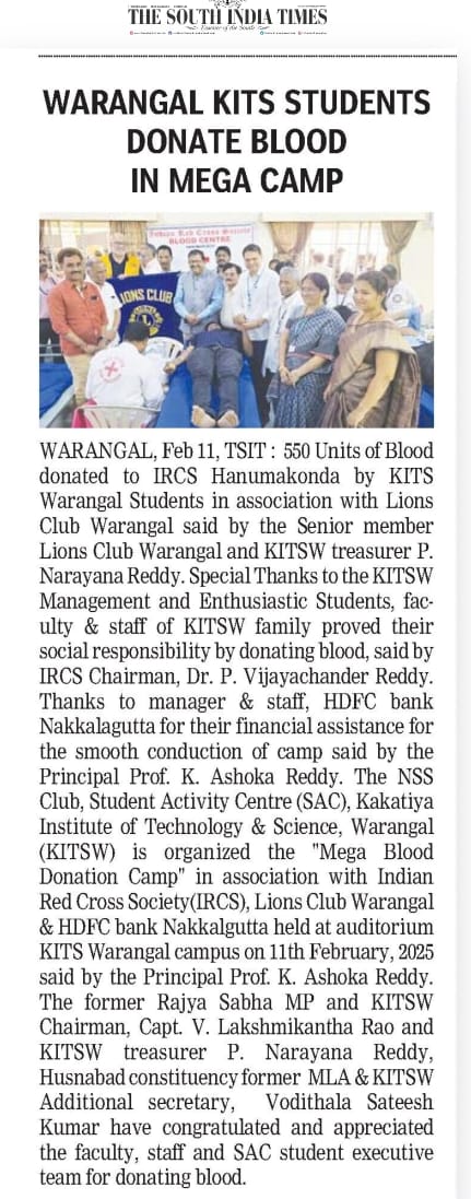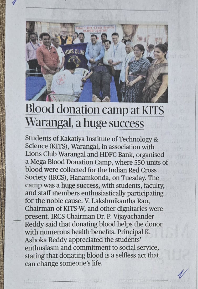 Students donate 550 units of blood to IRCS, Hanamkonda in a mega camp @ Auditorium, KITS, Warangal