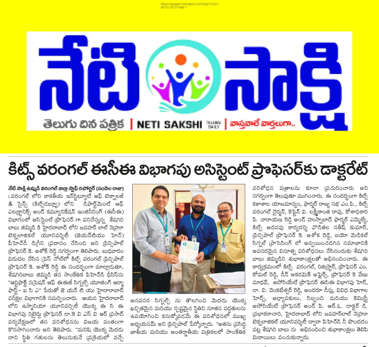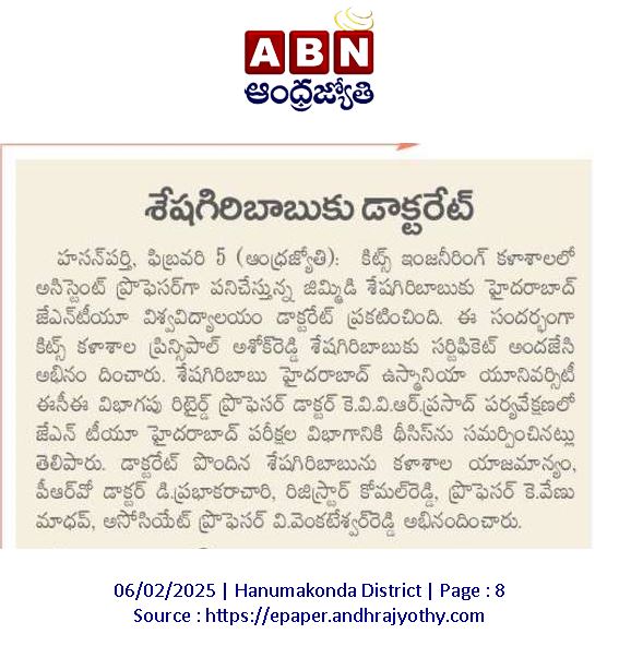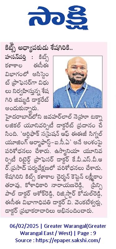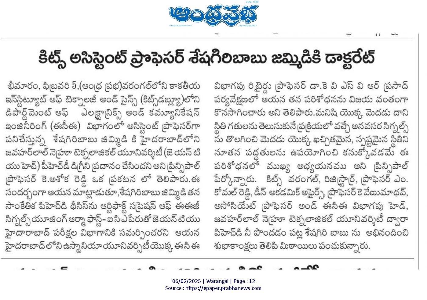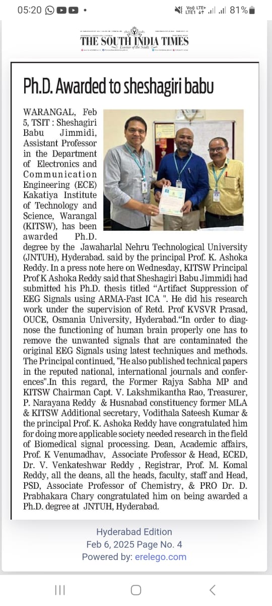 Sheshagiri Babu Jimmadi, Assistant Professor in the Department of Electronics & Communication Engineering(ECE) has been awarded Ph.D. degree by the Jawaharlal Nehru Technological University, Hyderabad.
