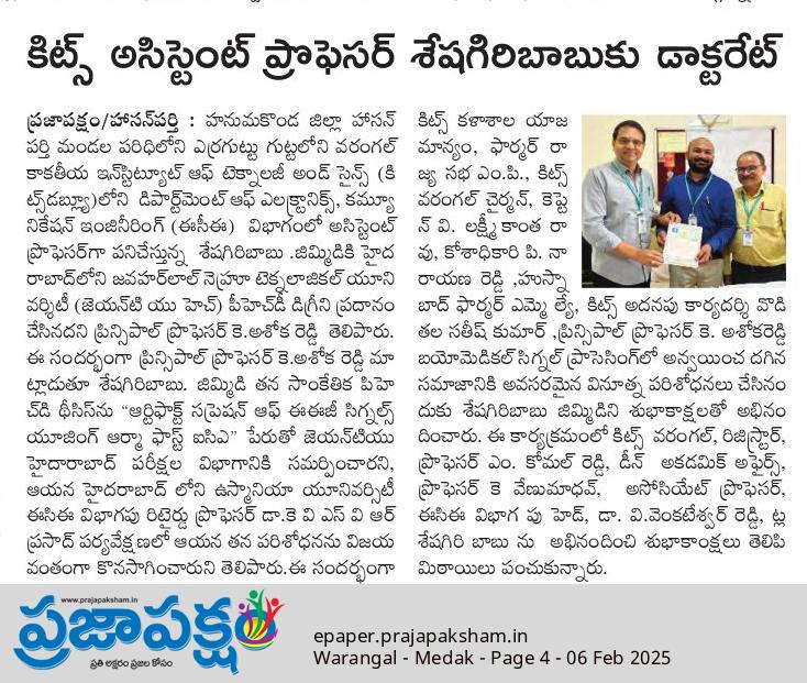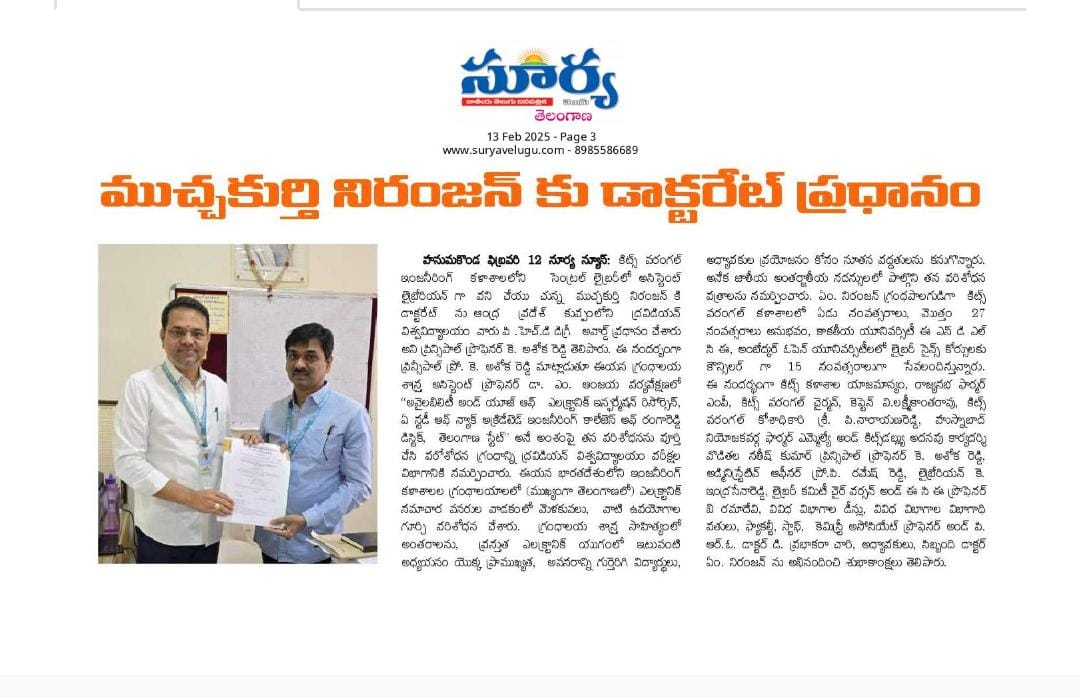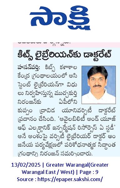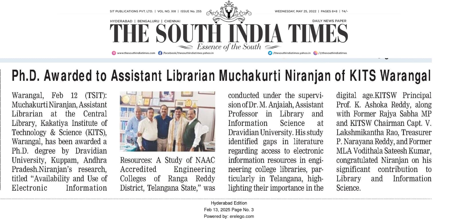 Ph.D degree awarded to Assistant Librarian, Muchakurti Niranjan of KITS, Warangal by Dravidian University, Kuppam, Andhra Pradesh.
