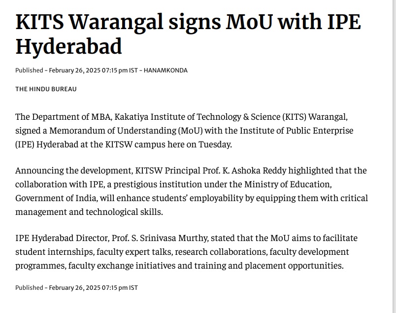 Department of MBA, KITS, Warangal signs MoU with Institute of Public Enterprise(IPE), Hyderabad.