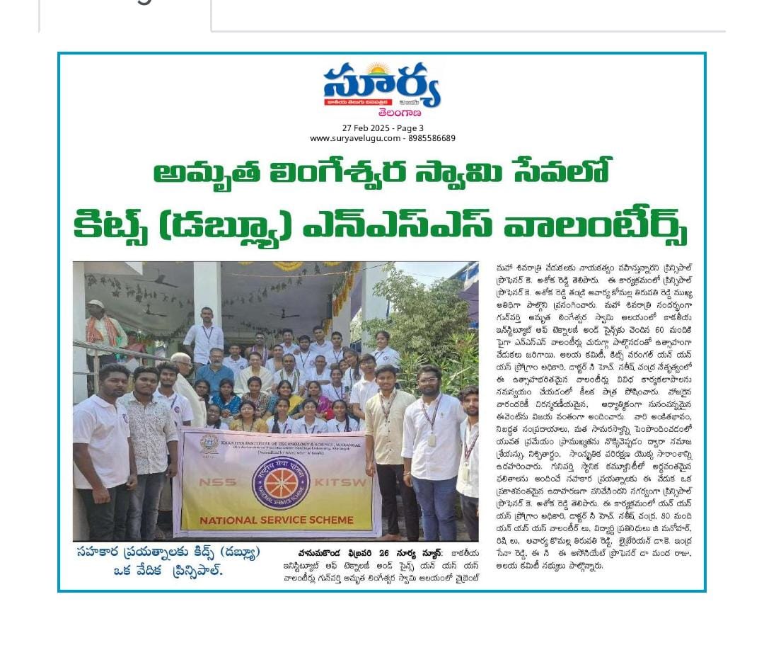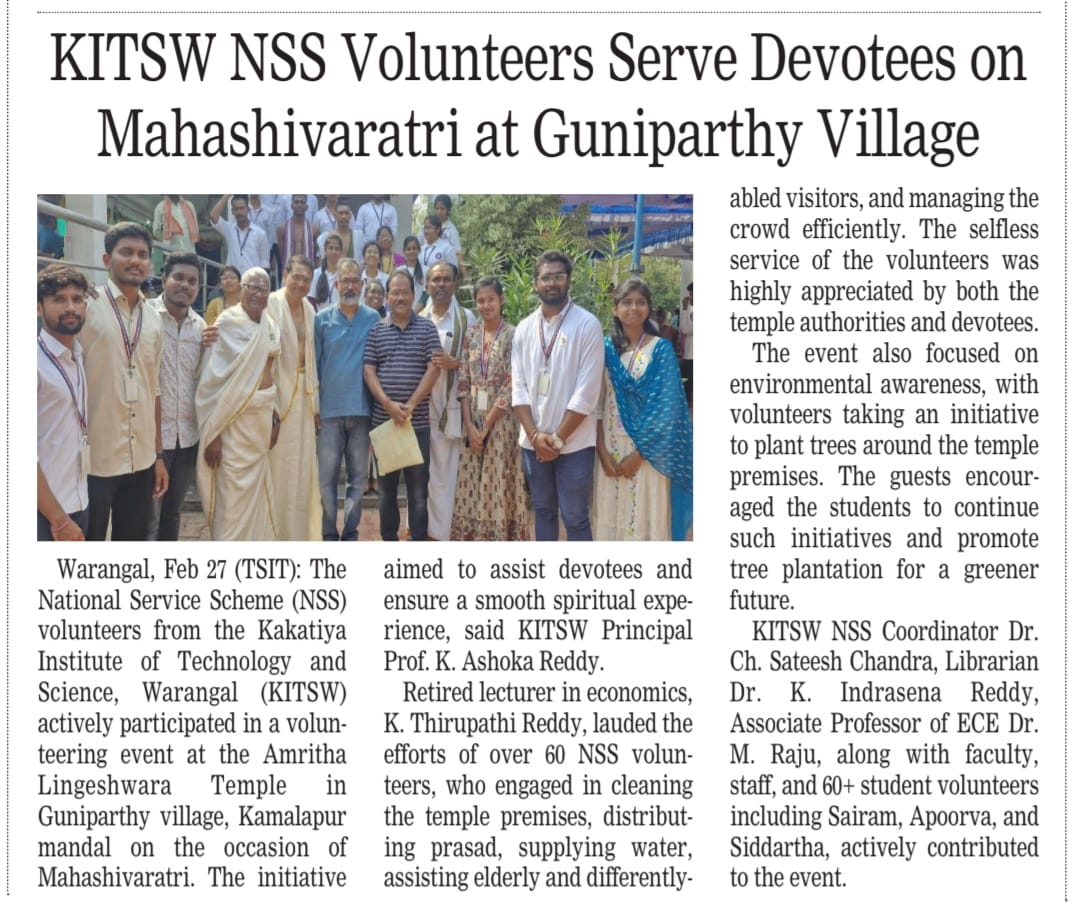NSS Volunteers, KITS, Warangal serves devotees on Mahashivarathri at Guniparthy village, Hanamkonda.