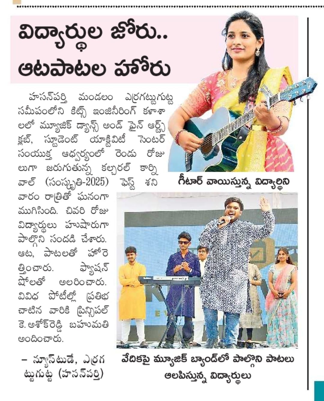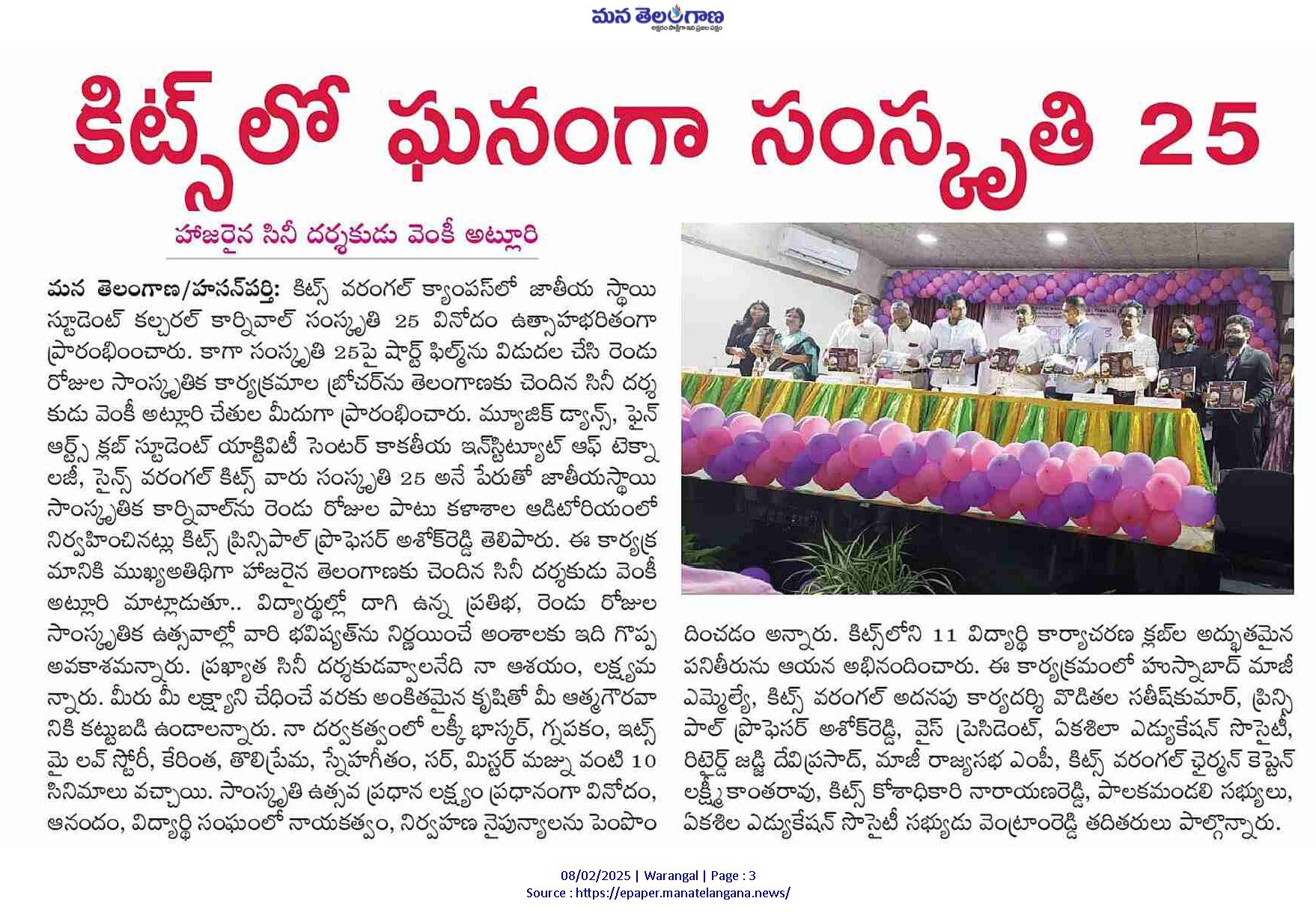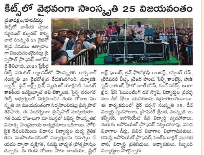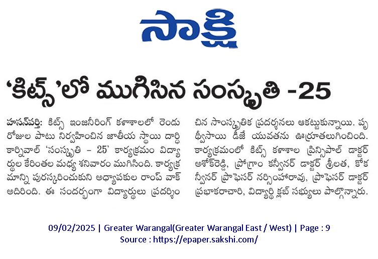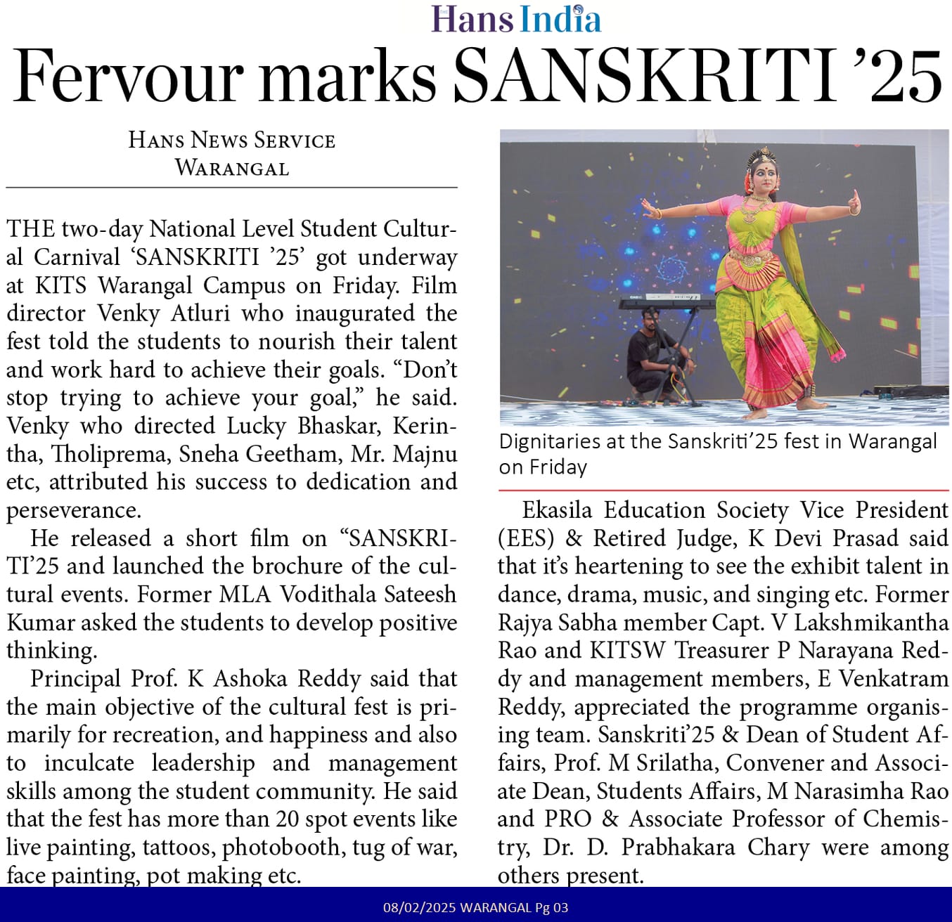 Inaugural Ceremony of Cultural Carnival "SANSKRITI'25" held on 7th February @ Auditorium, KITS, Warangal.