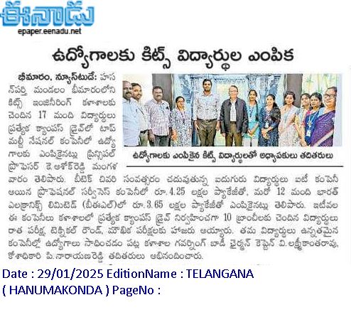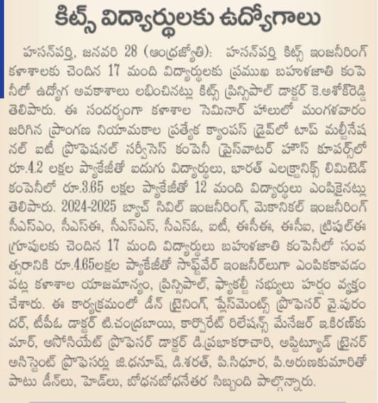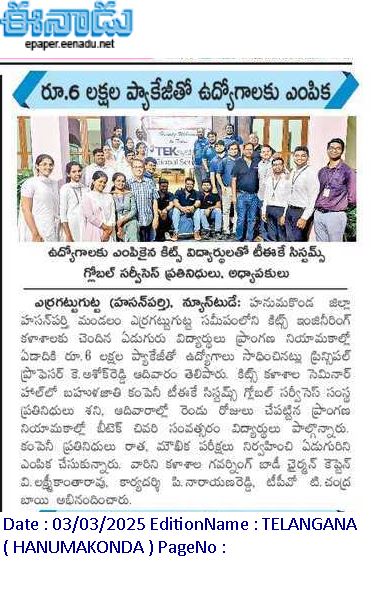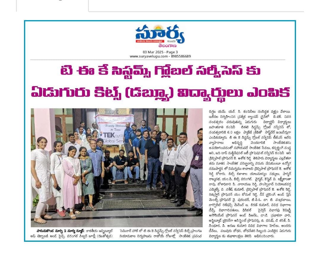 Seven B.Tech final year students secured placements with an annujal package of 6 LPA at TEKSystems through an exclusive campus placement drive held at KITSW.