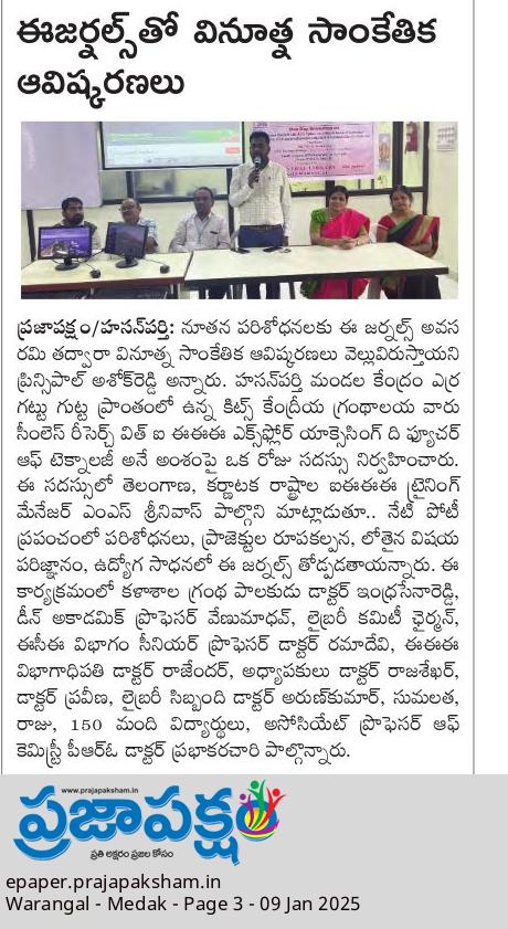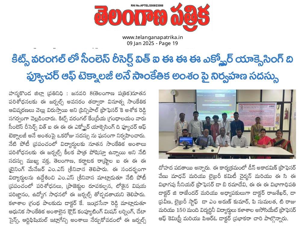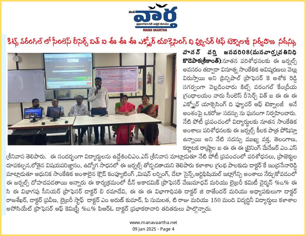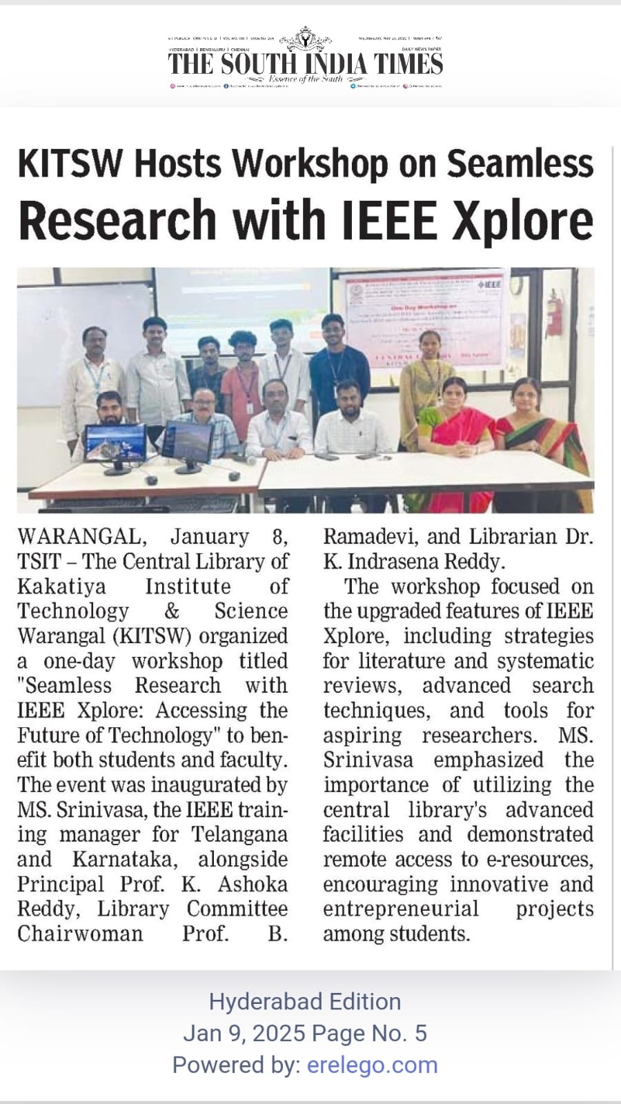 The Central Library, KITS, Warangal organised a one day workshop titled "Seamless Research with IEEE Xplore: Accessing the Future of Technology"