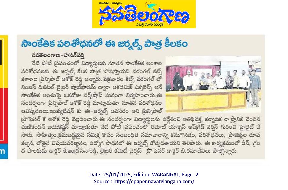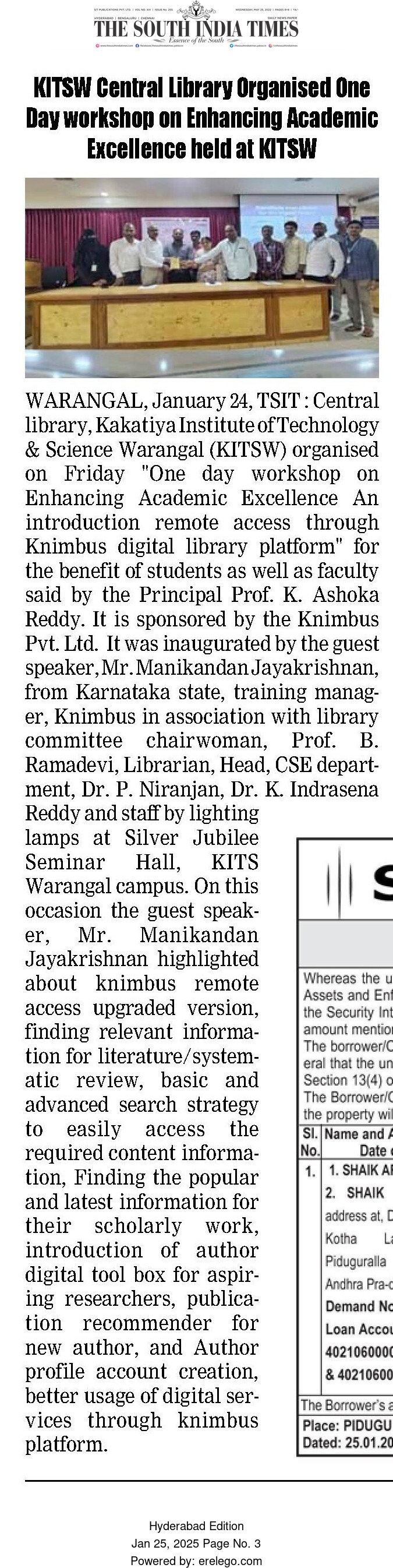 A one day Workshop on “Enhancing Academic Excellence: An Introduction to the Knimbus Digital Library Platform”. (Sponsored by Knimbus Online Pvt.Ltd.,New Delhi) was conducted on 24/01/2025 by Central Library, KITS Warangal for the benefit of students of CSE 3 year students