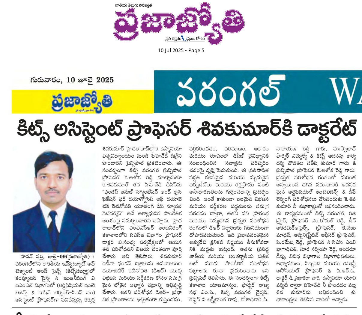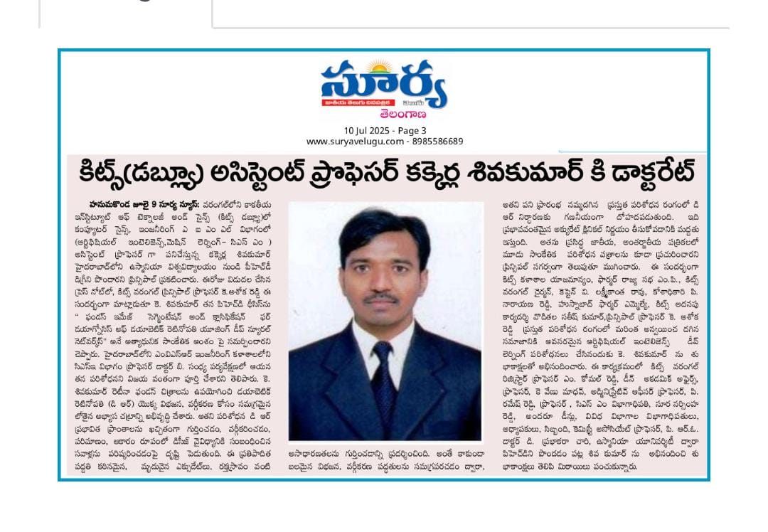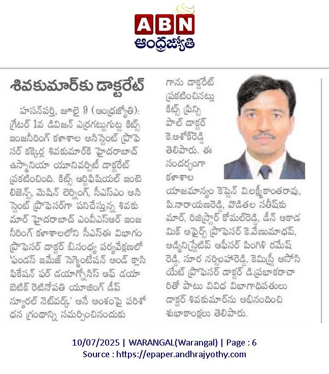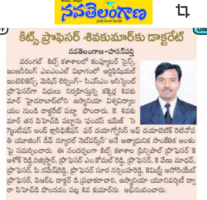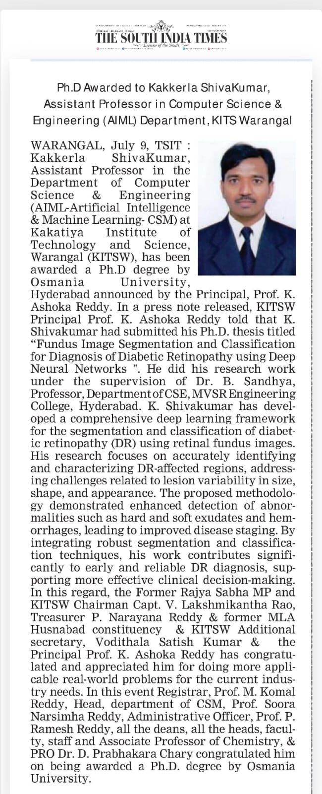 Sri K.Shiva Kumar, Assistant Professor in the Department of Computer Science and Engineering(AIML) has been awarded Ph.D. degree by Osmania University, Hyderabad, Telangana for his thesis, titled "Fundus Image Segmentation and Classification for Diagnosis of Diabetic Retinopathy using Deep Neural Networks " under the Guidance of Dr. B.Sandhya Rani, Professor, Department of CSE, MVSR Engineering College, Hyderabad.