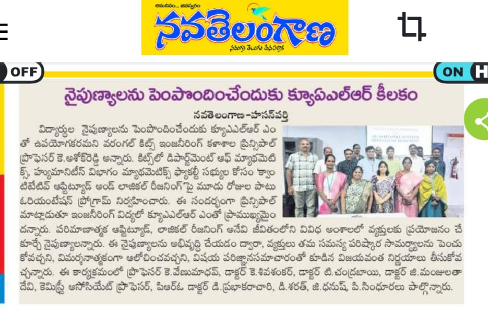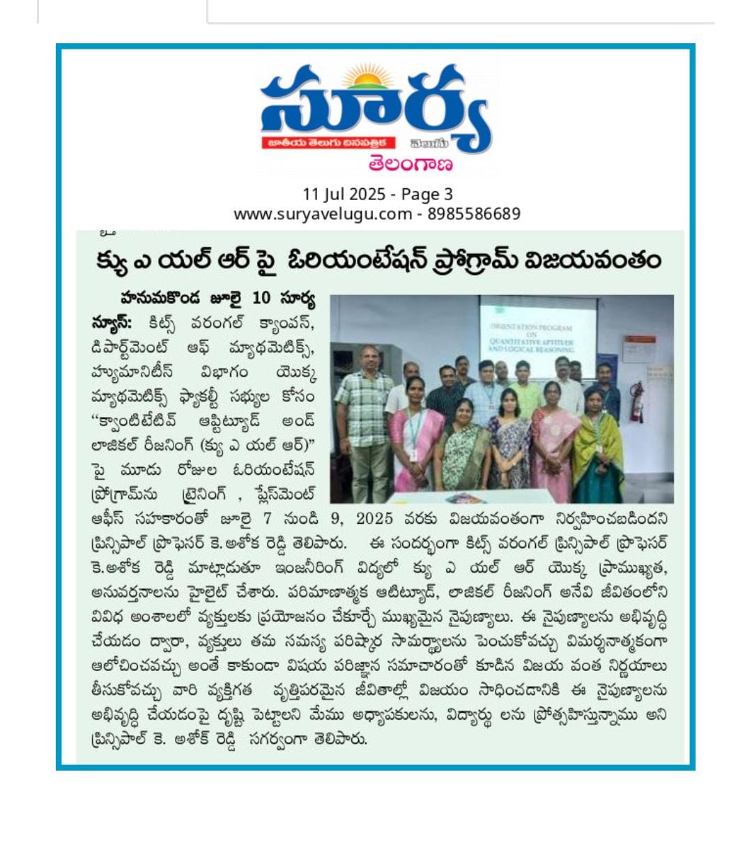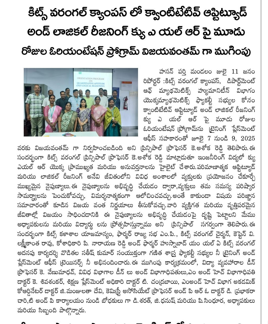 Training and Placement section, KITS, Warangal organised a 3 day orientation programme on "Quantitative Aptitude and Logical Reasoning" during 7 - 9 July, 2025 @ KITSW.